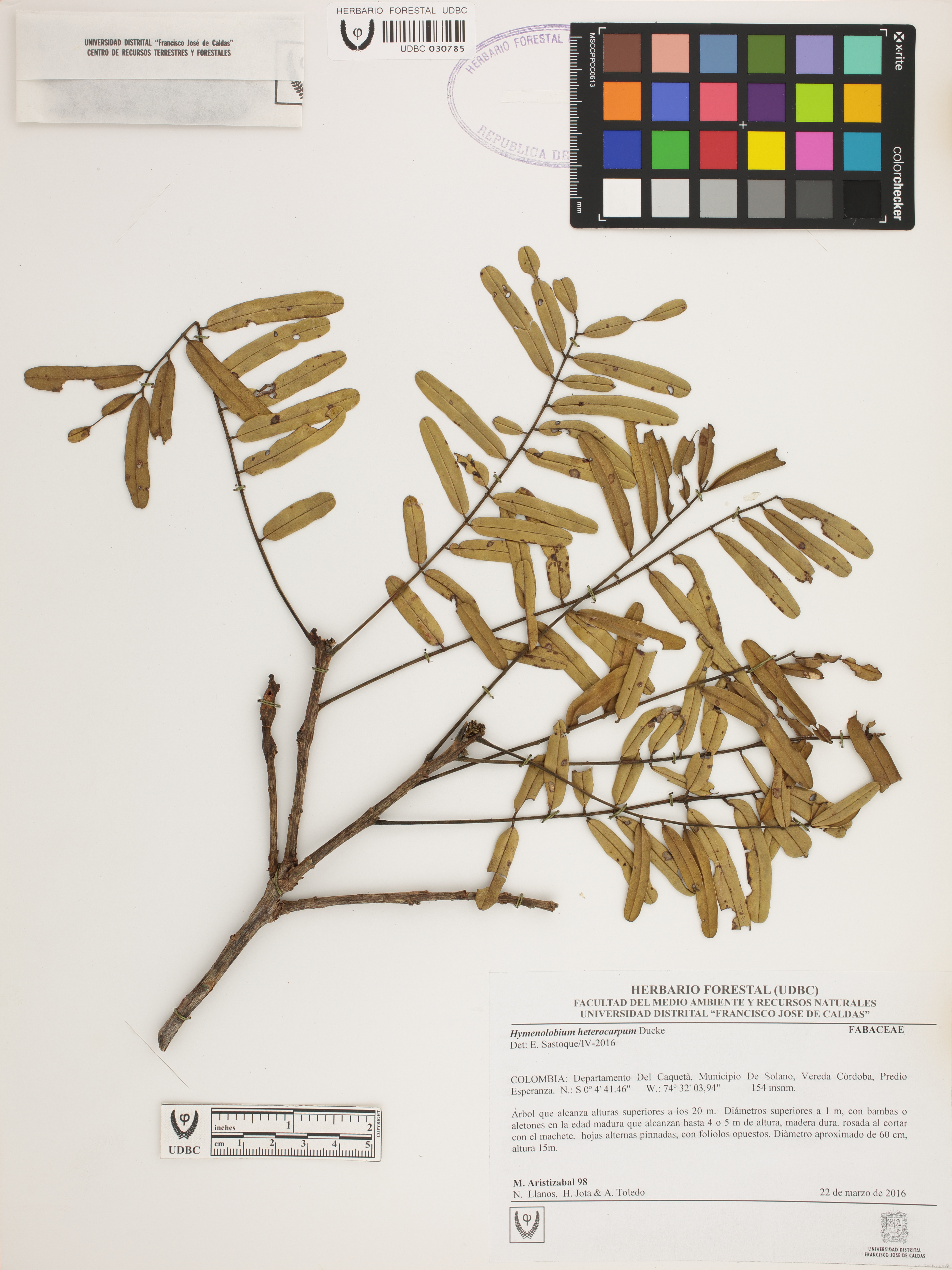 Fotografía del ejemplar Aristizábal, M. 98, determinado como Hymenolobium heterocarpum en el año 2016
