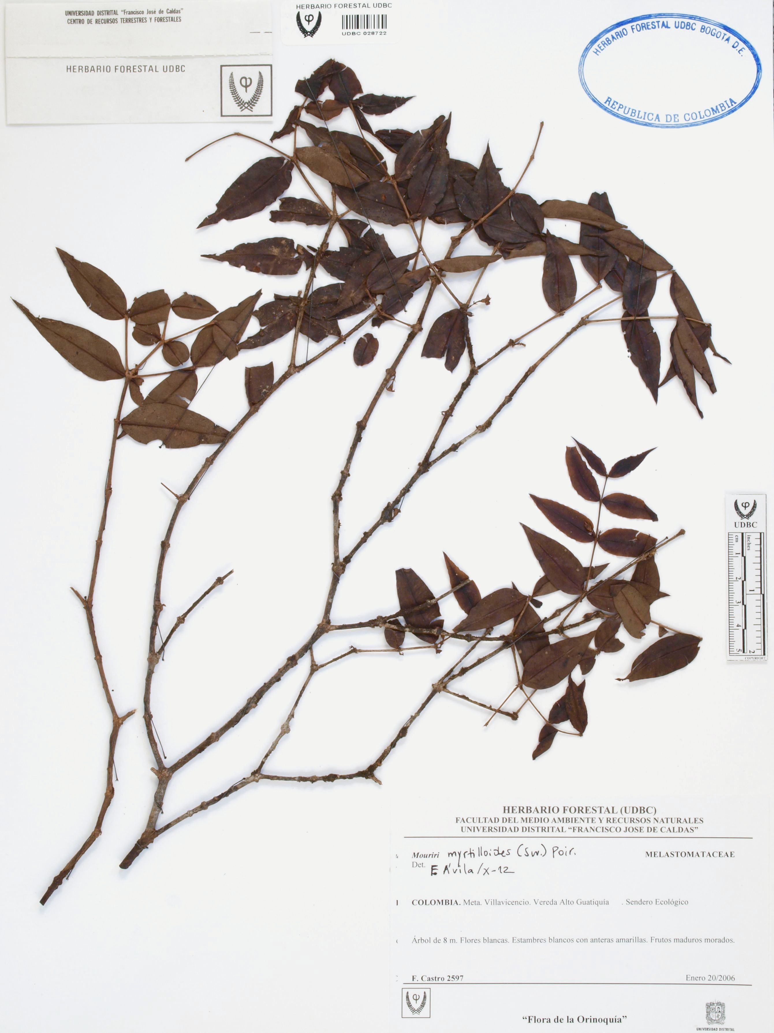 Fotografía del ejemplar Castro, F. 2597, determinado como Mouriri myrtilloides en el año 2012