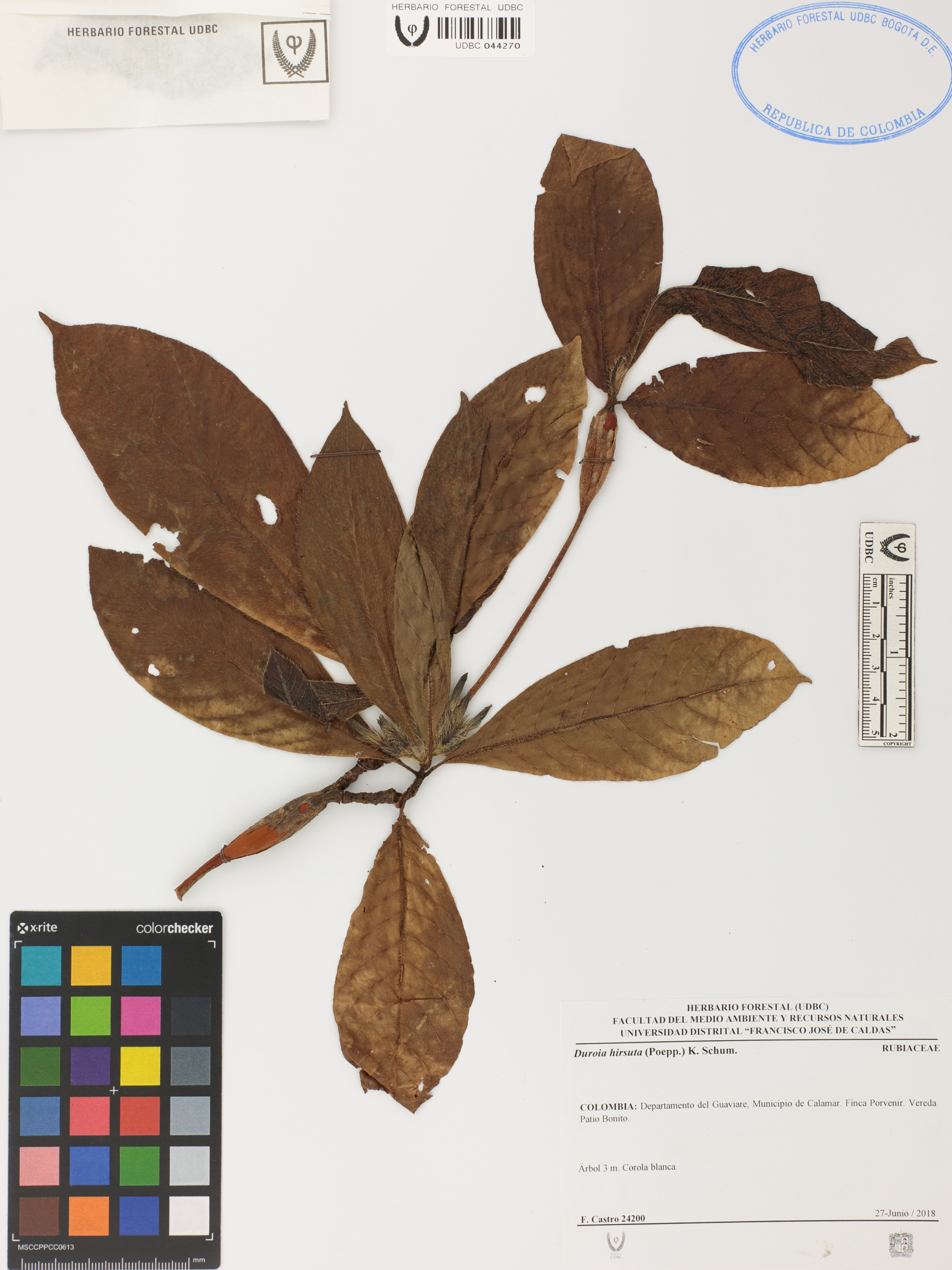 | dc.description | Fotografía del ejemplar Castro, F. 24200, determinado como Duroia hirsuta en el año 2018 | |