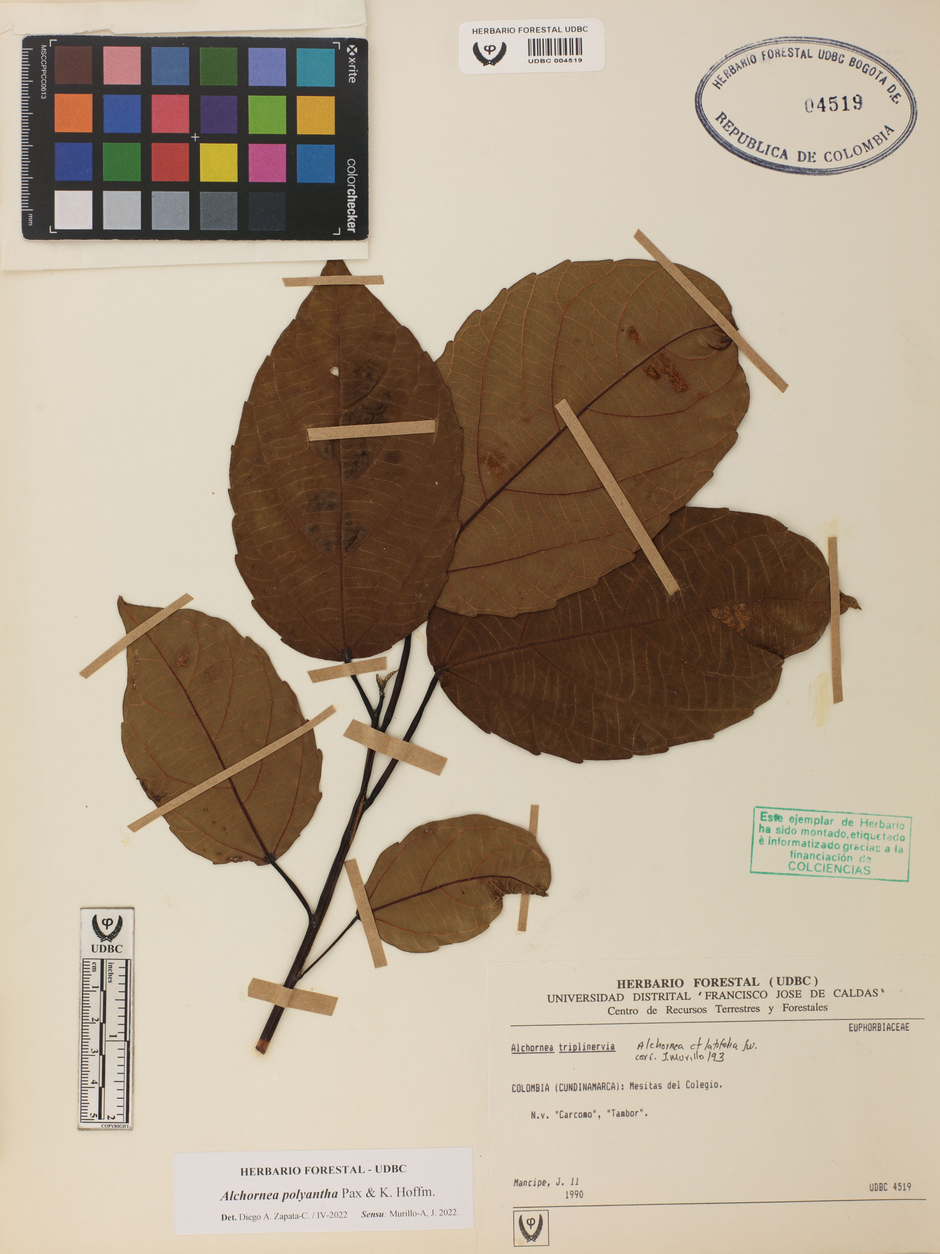 Fotografía del ejemplar Mancipe, J. 11, determinado como Alchornea polyantha en el año 2022