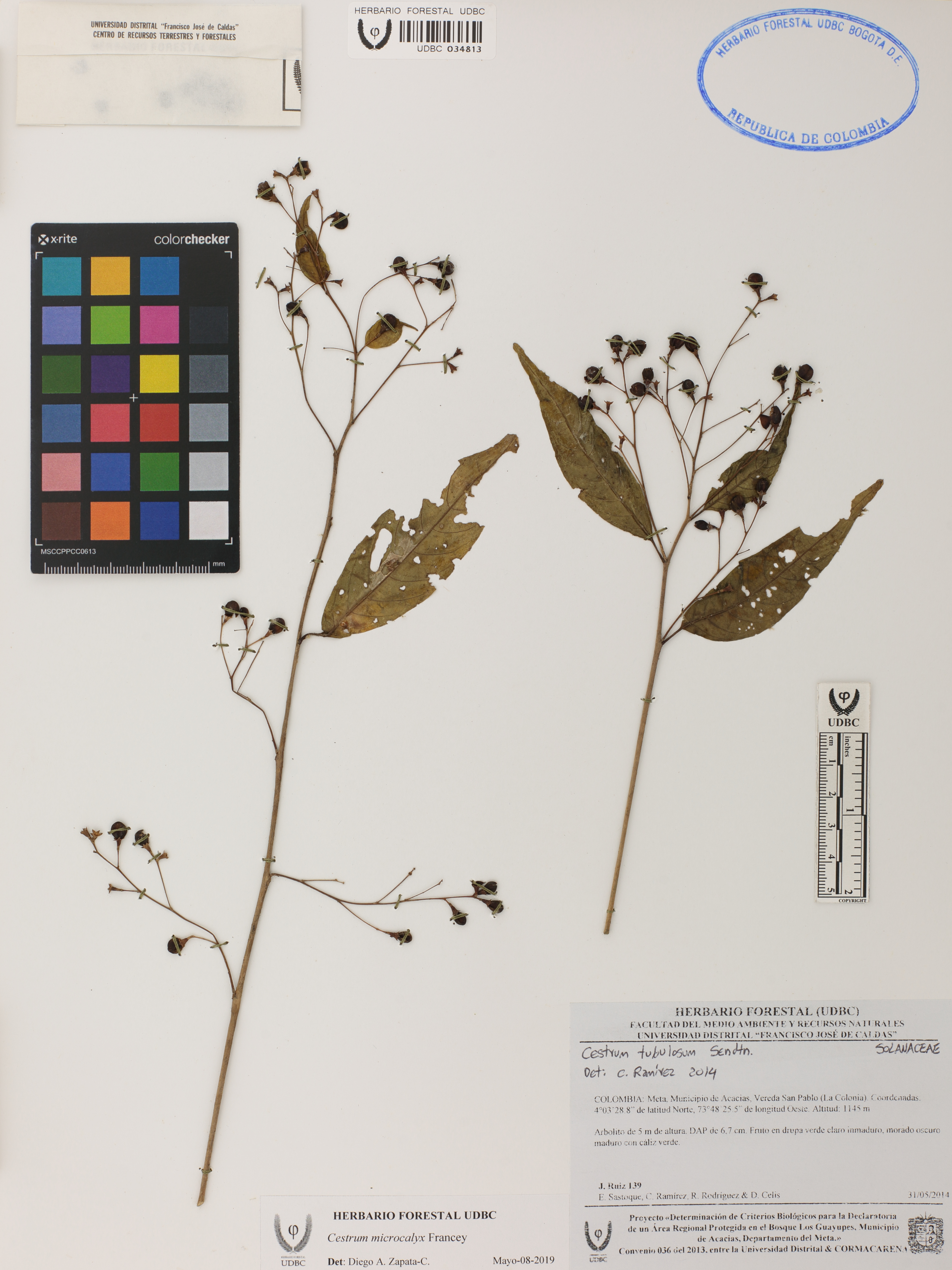 Fotografía del ejemplar Ruiz, J. 139, determinado como Cestrum microcalyx en el año 2019