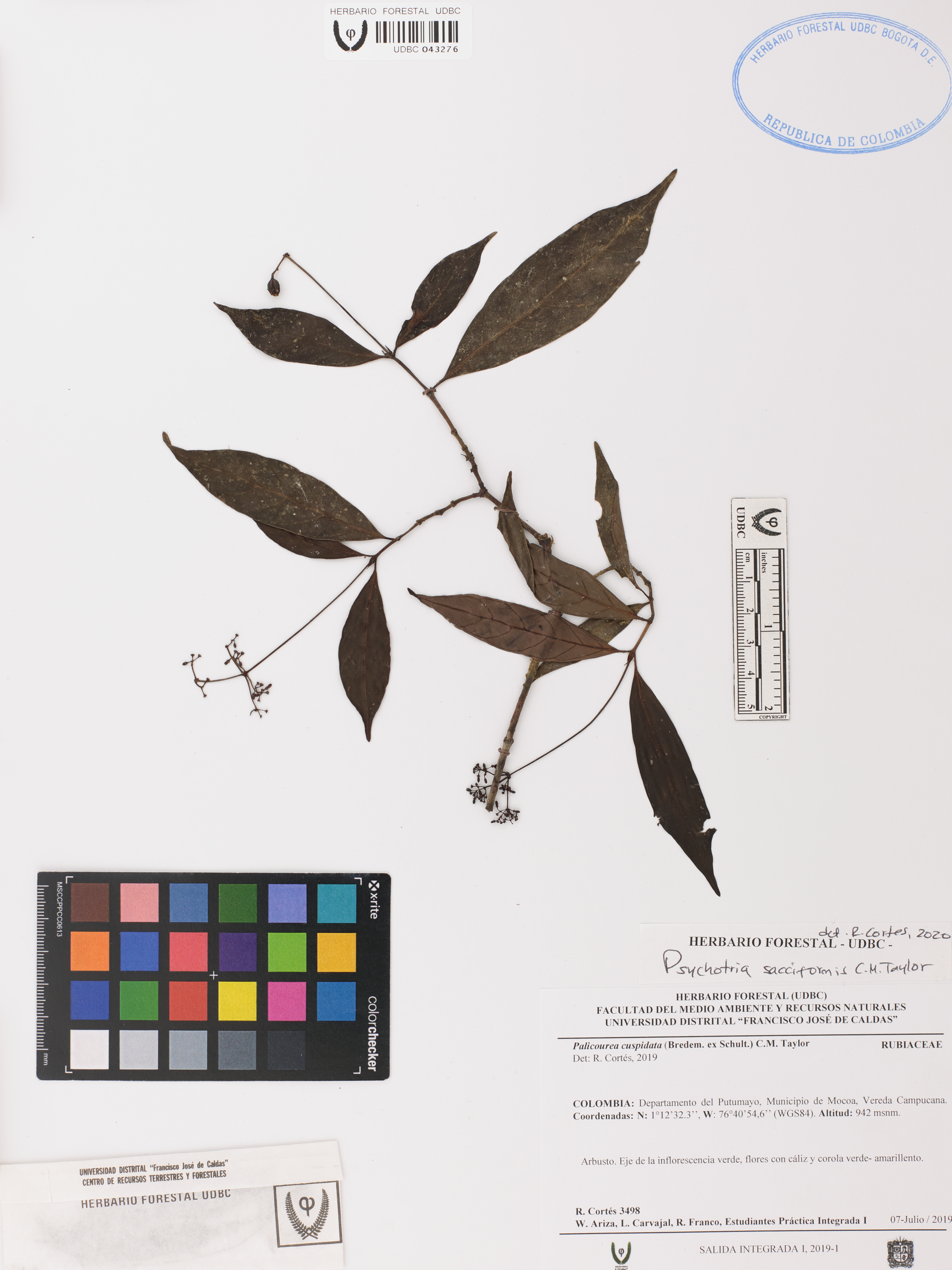 Fotografía del ejemplar Cortés, R. 3498, determinado como Psychotria sacciformis en el año 2020
