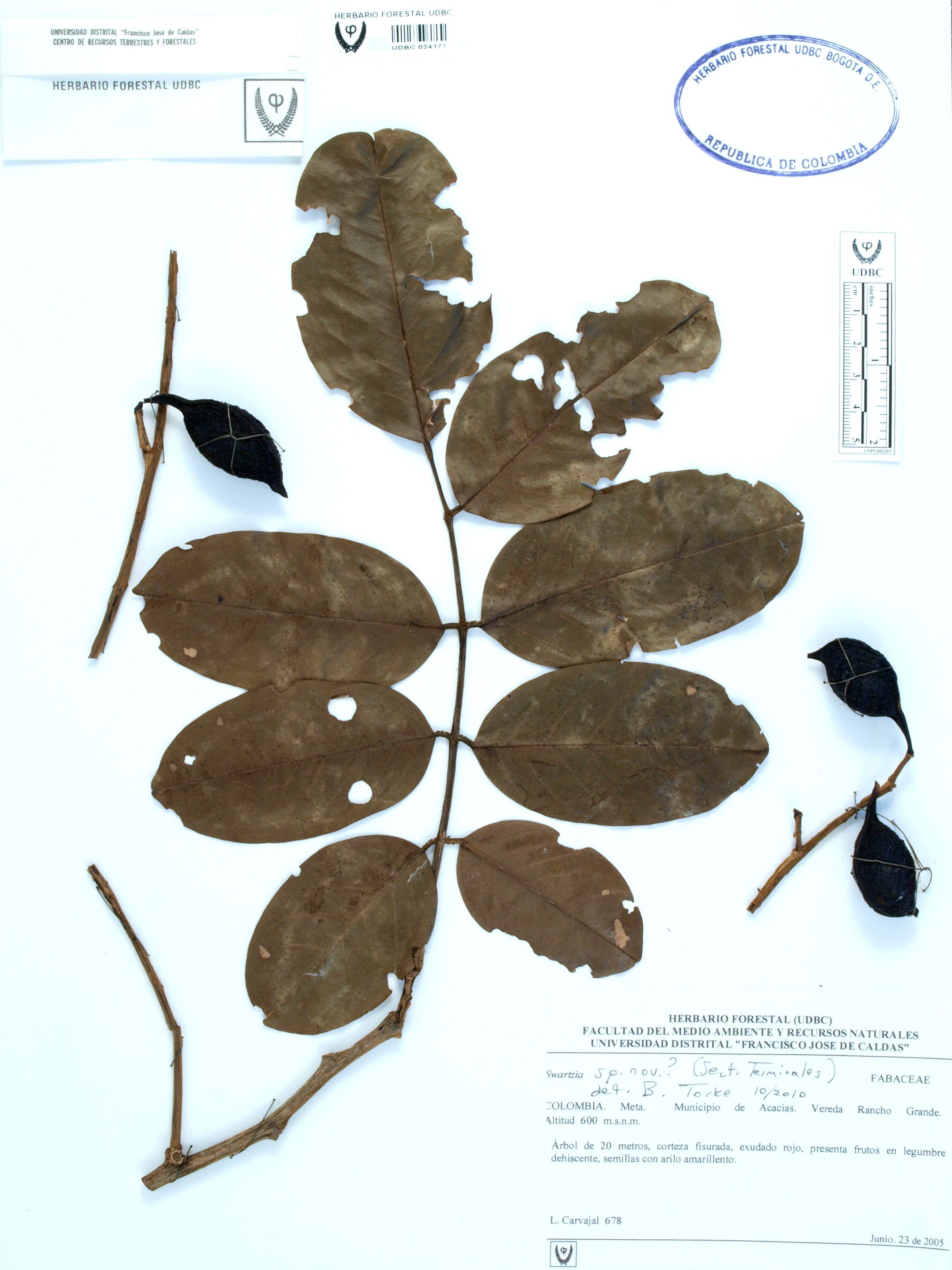 | dc.description | Fotografía del ejemplar Carvajal, L. 678, determinado como Swartzia sp. | |