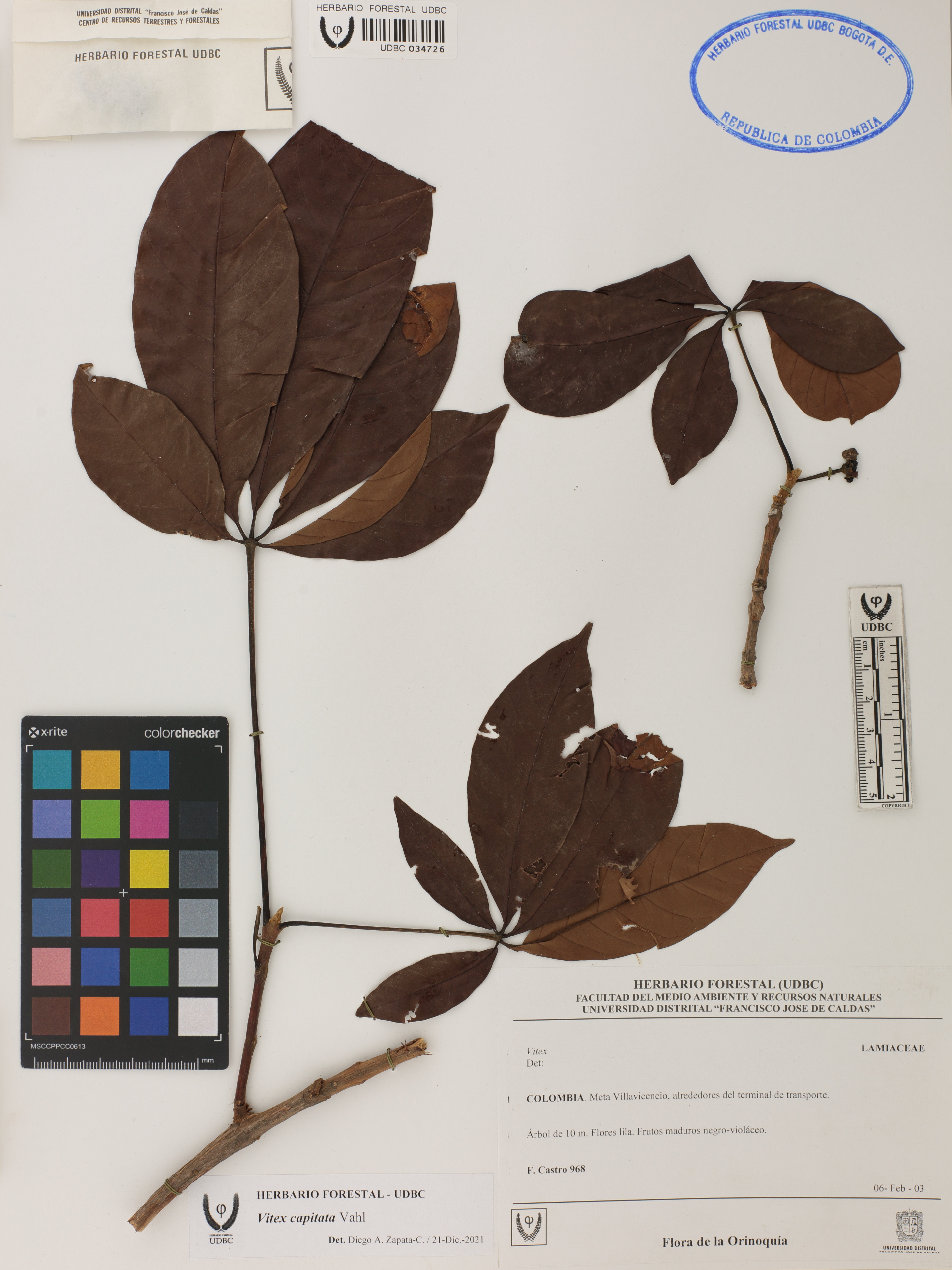 Fotografía del ejemplar Castro, F. 968, determinado como Vitex capitata en el año 2021