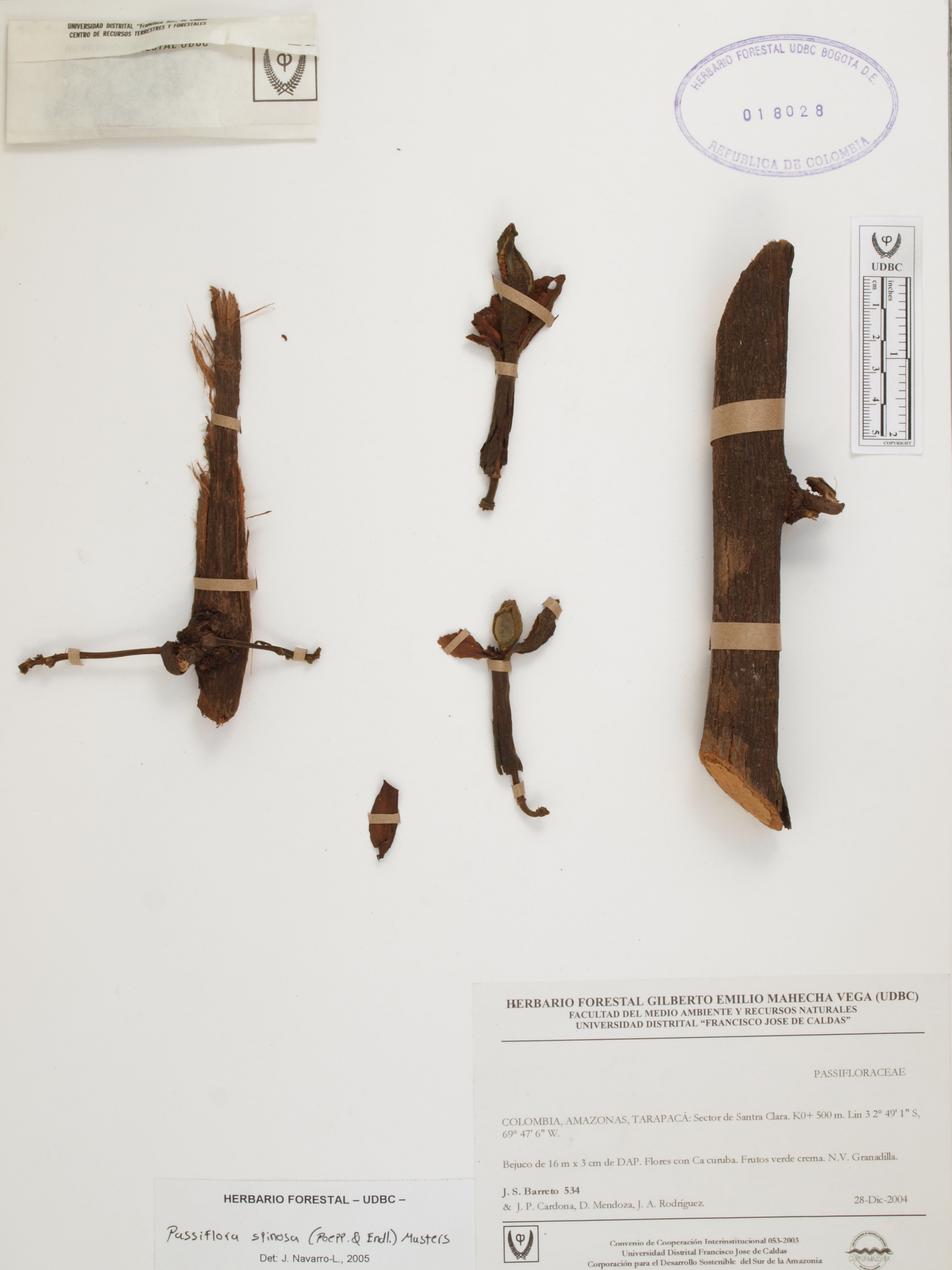 Fotografía del ejemplar Barreto, J. 534, determinado como Passiflora spinosa en el año 2005