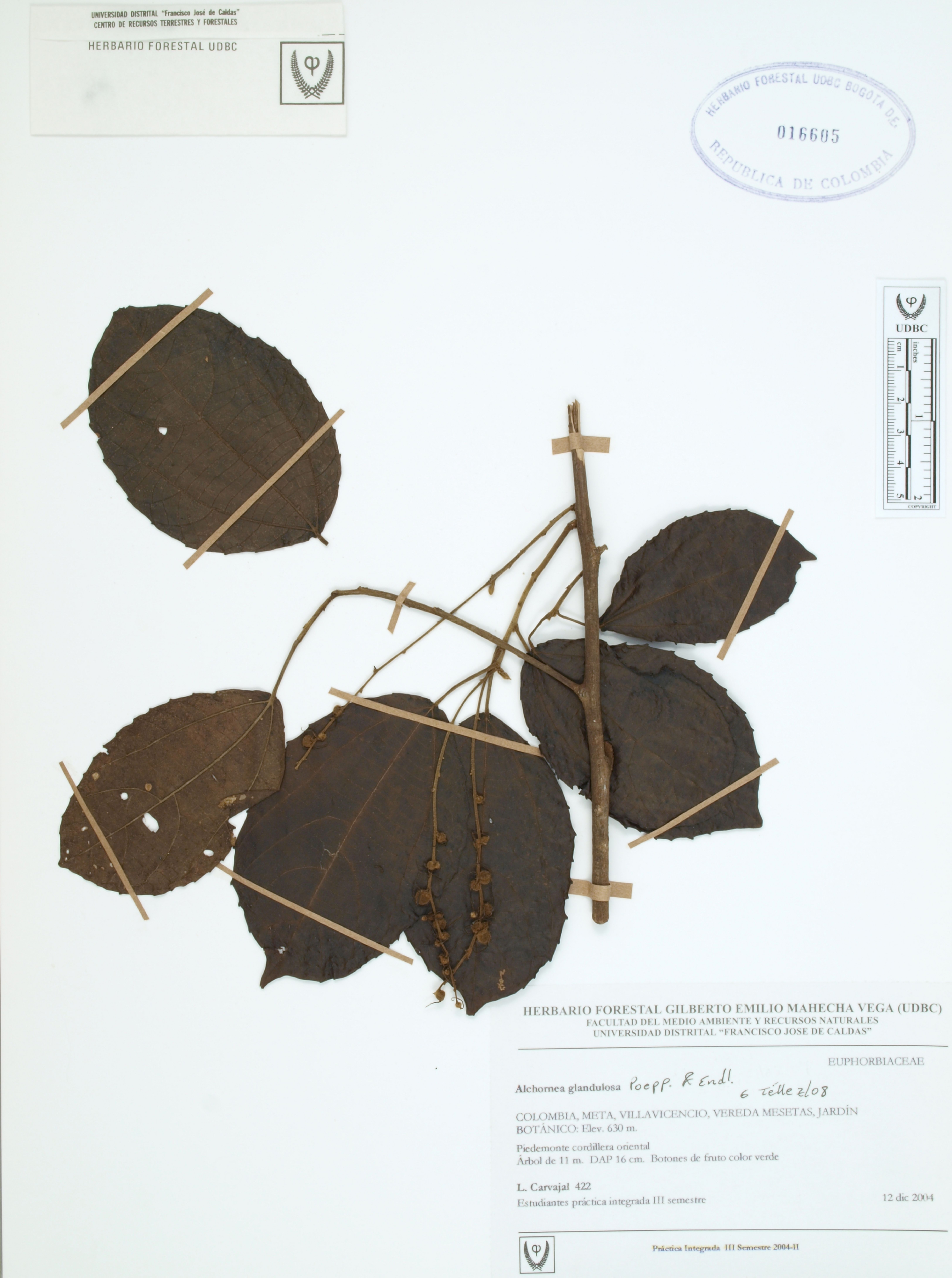 Fotografía del ejemplar Carvajal, L. 422, determinado como Alchornea glandulosa