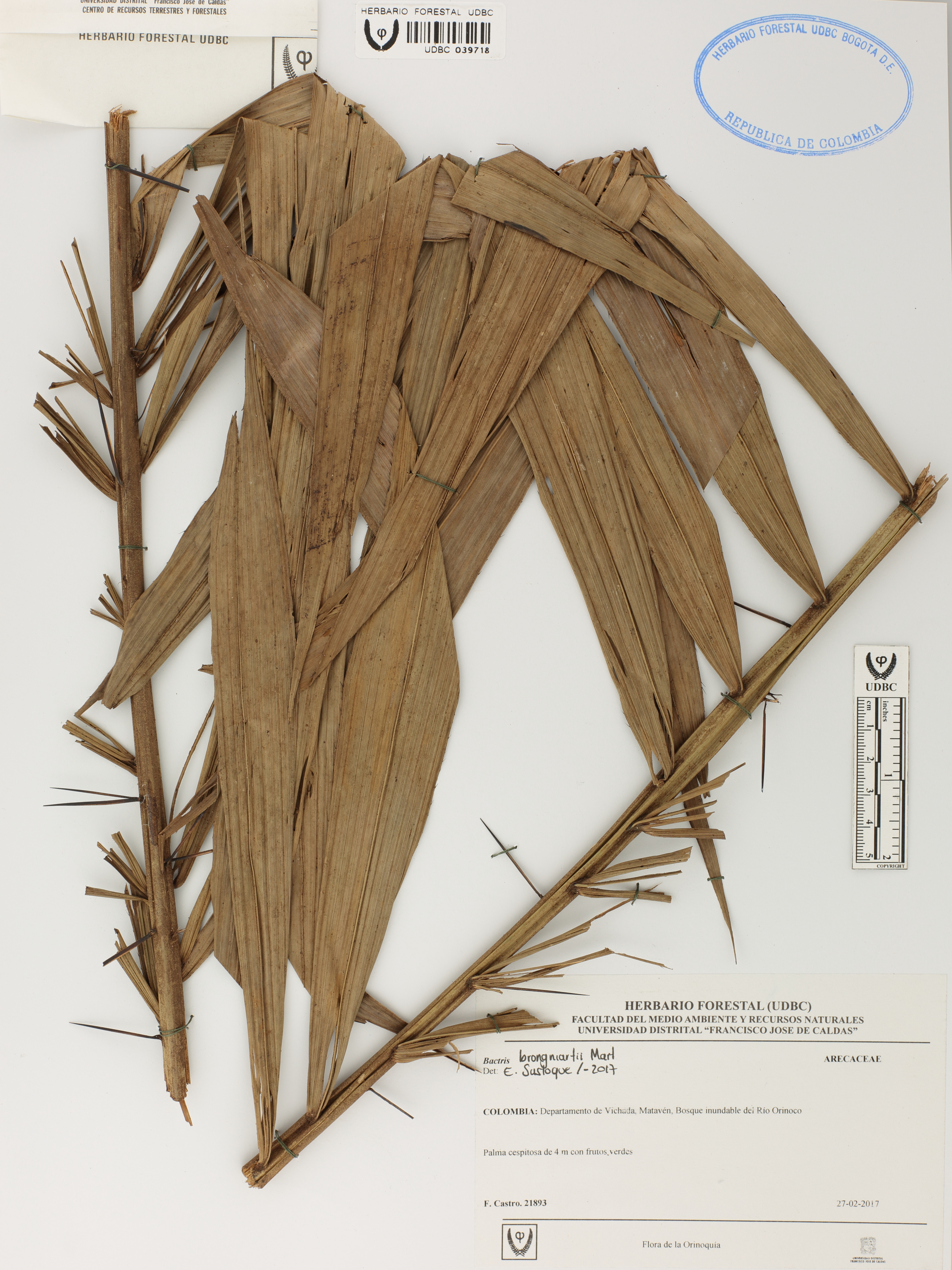 Fotografía del ejemplar Castro, F. 21983, determinado como Bactris brongniartii en el año 2017