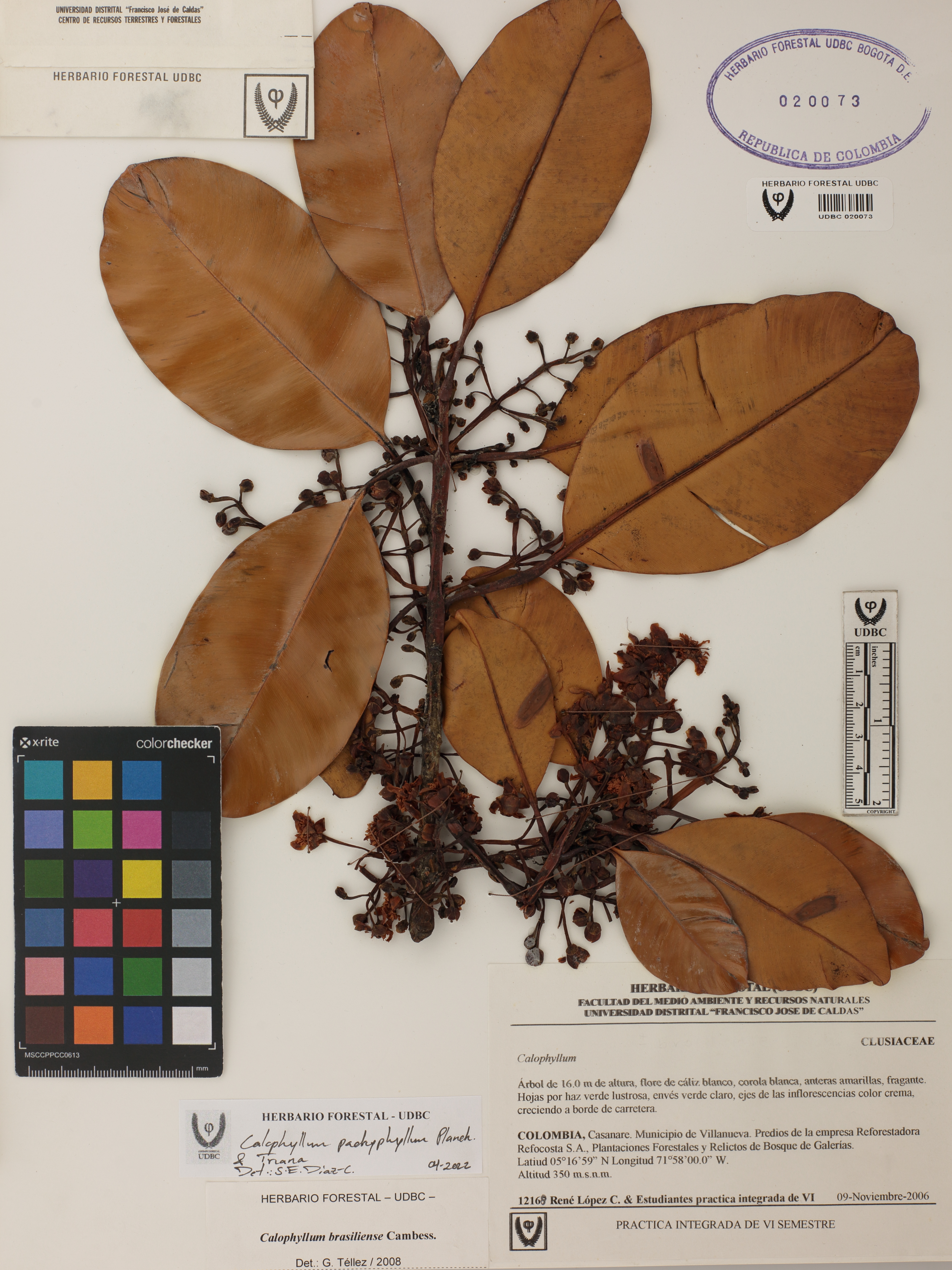 Fotografía del ejemplar López, R. 12168, determinado como Calophyllum pachyphyllum en el año 2022