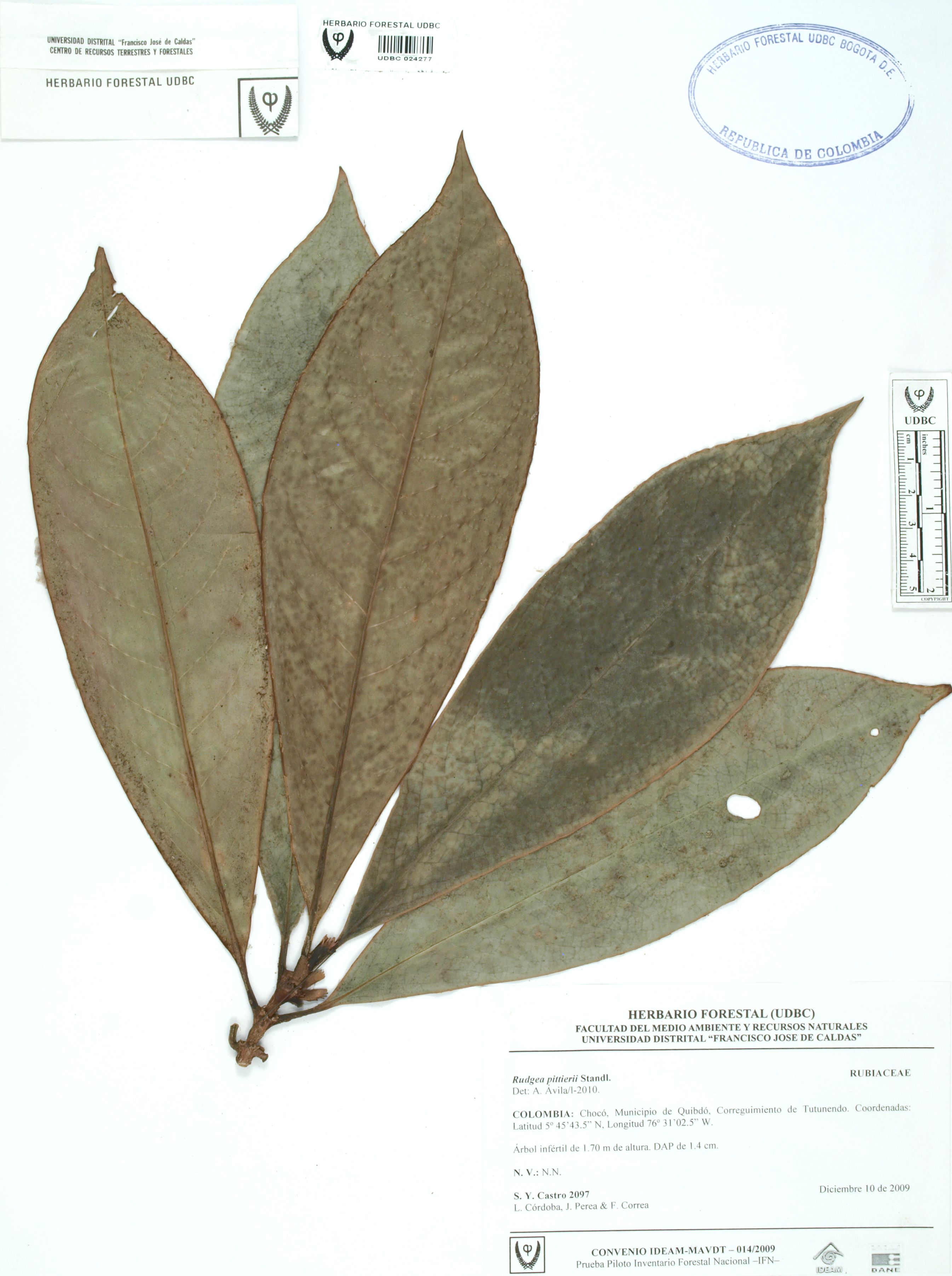 Fotografía del ejemplar Castro, S. 2097, determinado como Rudgea pittieri en el año 2010