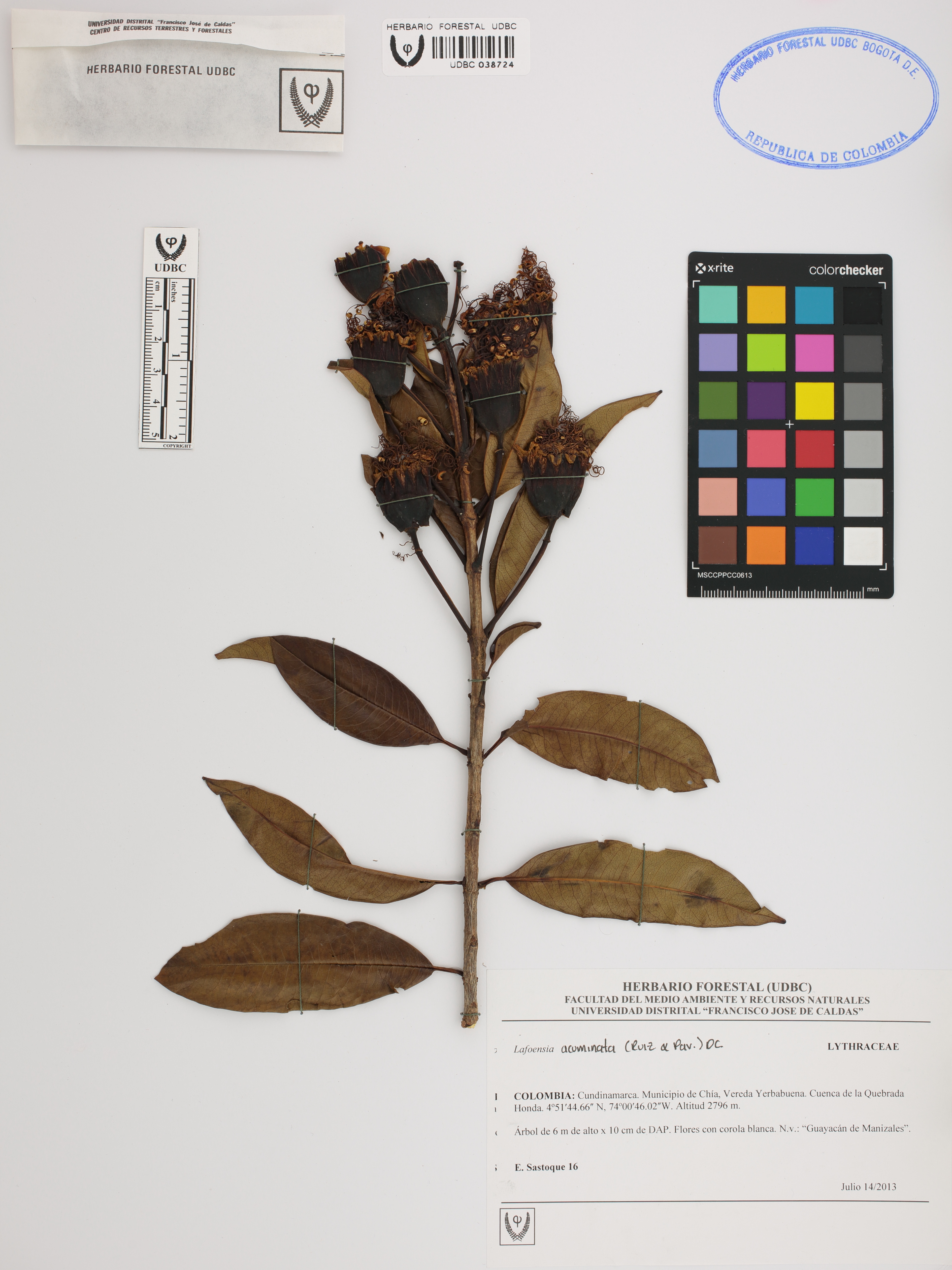 Fotografía del ejemplar Sastoque, E. 16, determinado como Lafoensia acuminata