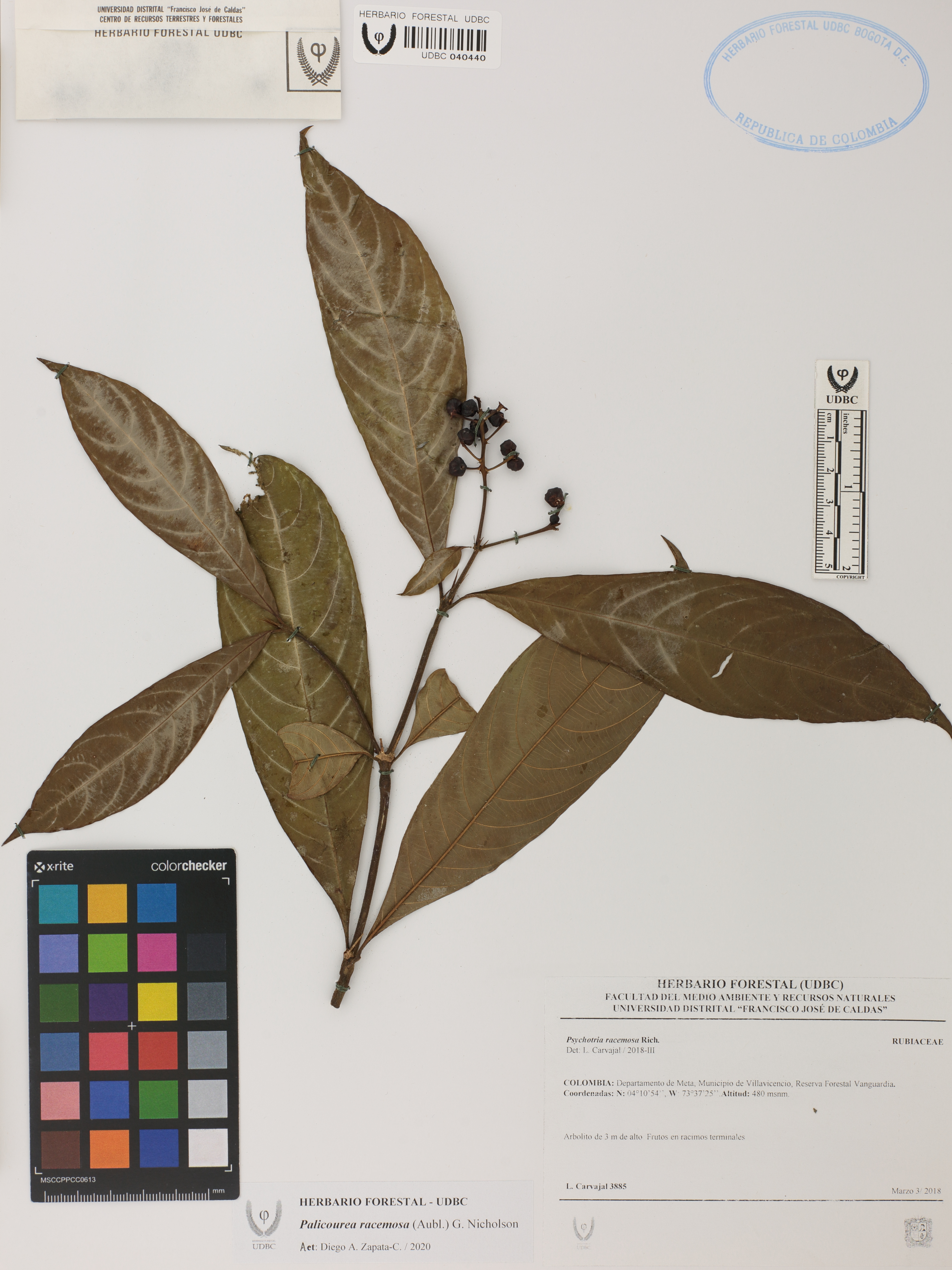 Fotografía del ejemplar Carvajal, L. 3885, determinado como Palicourea racemosa en el año 2018