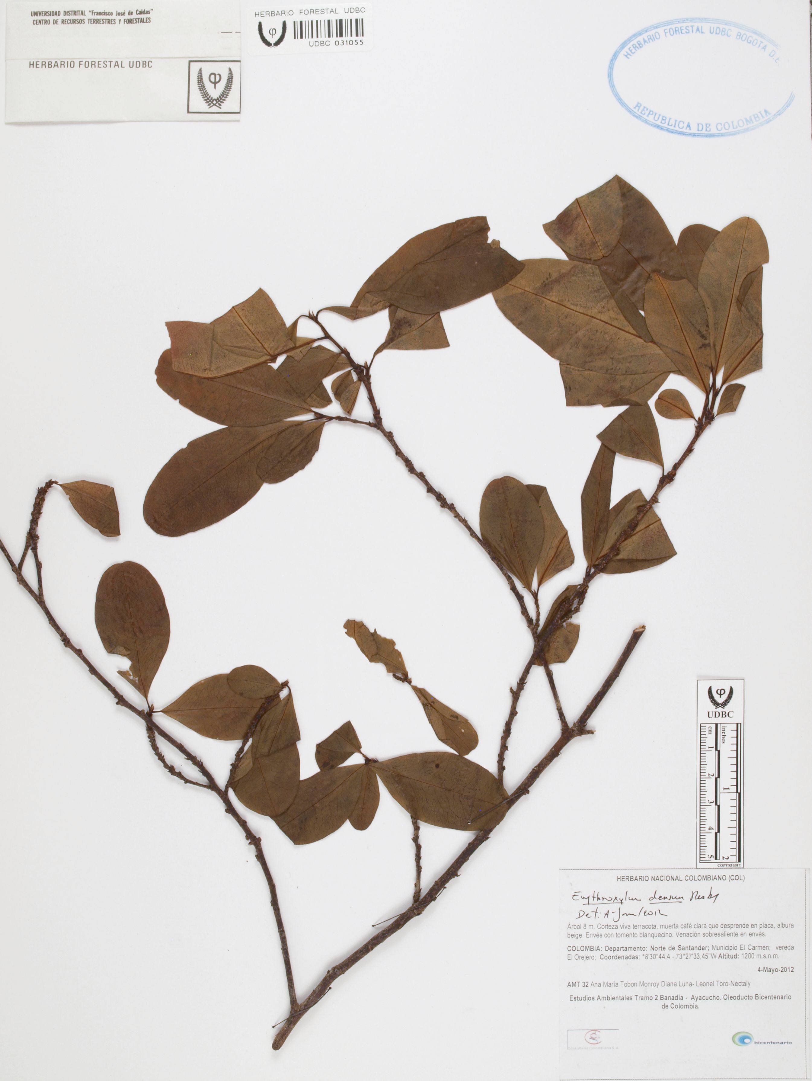 Fotografía del ejemplar Tobón, A. 32, determinado como Erythroxylum densum en el año 2012