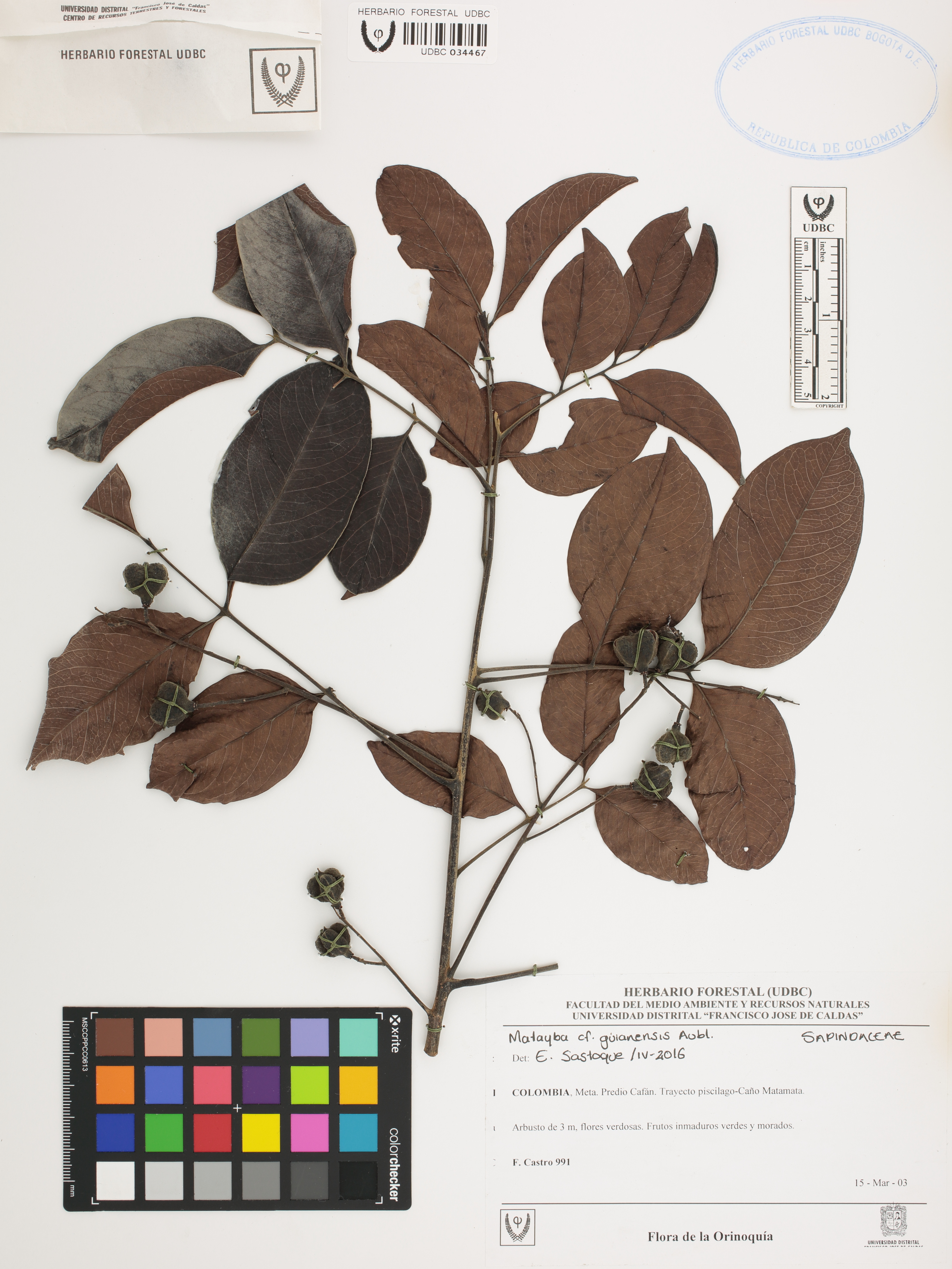 Fotografía del ejemplar Castro, F. 991, determinado como Matayba guianensis en el año 2016