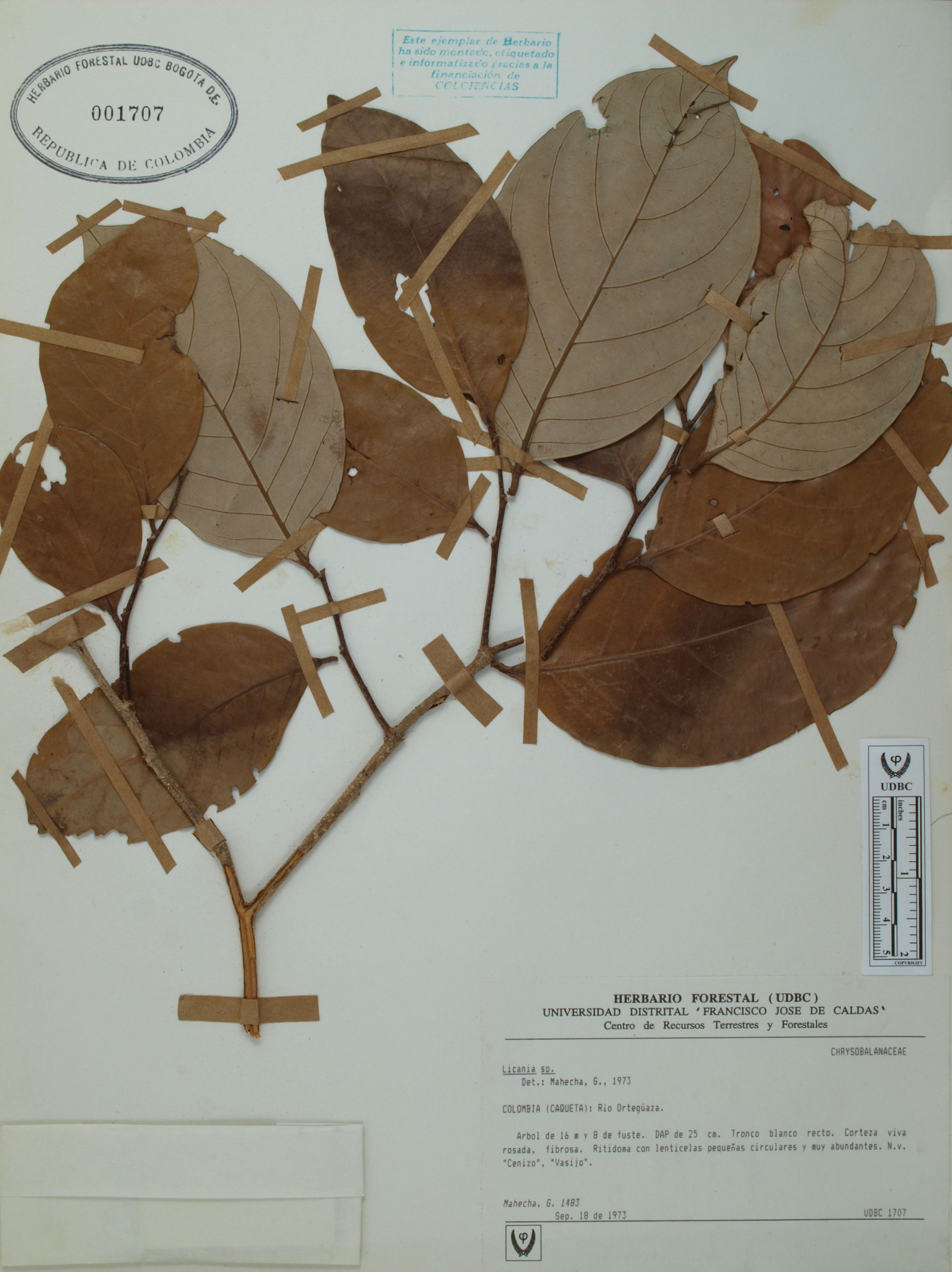 Fotografía del ejemplar Mahecha, G. 1483, determinado como Licania sp. en el año 1973