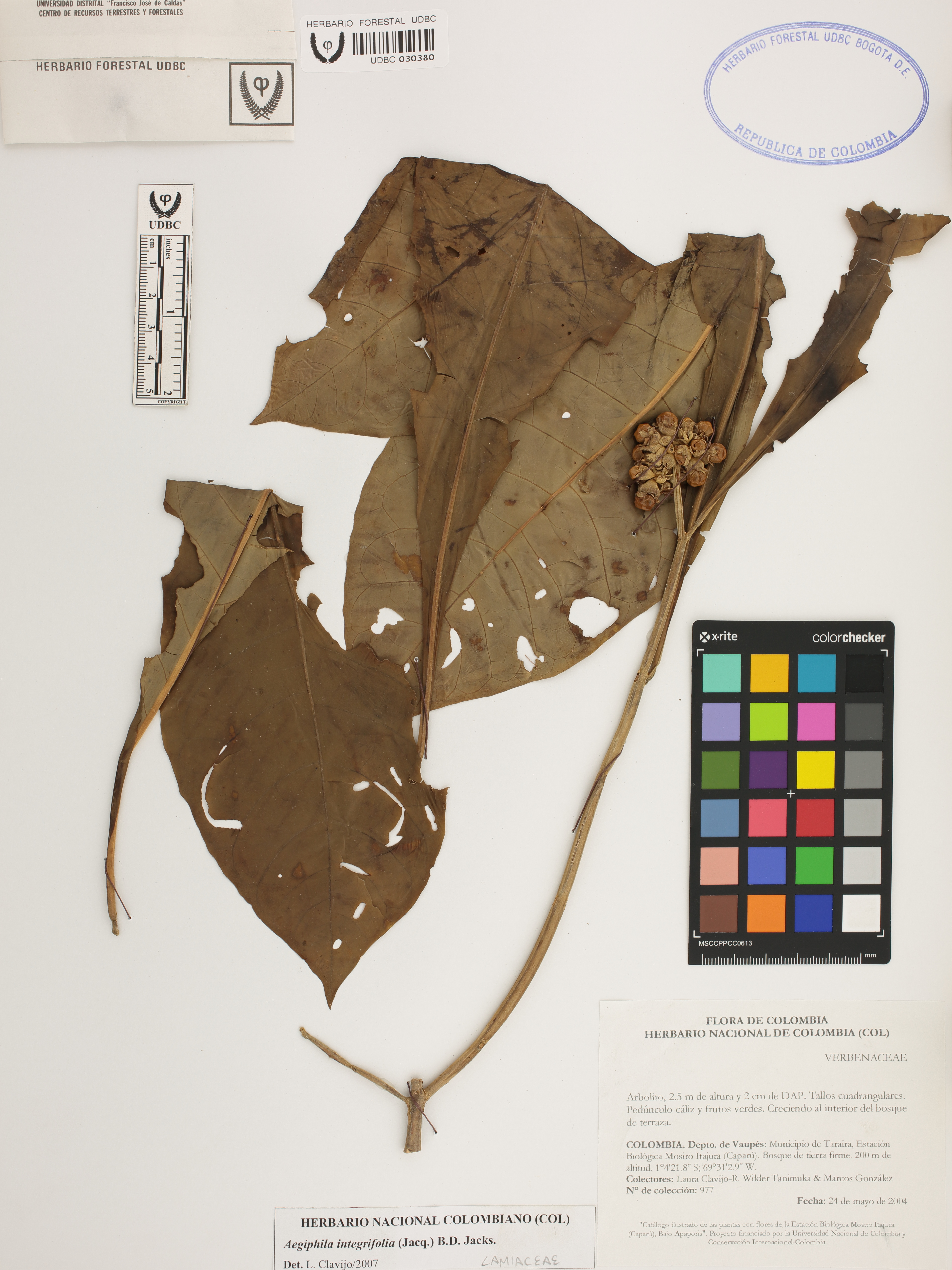 Fotografía del ejemplar Clavijo-R., L. 977, determinado como Aegiphila integrifolia en el año 2007