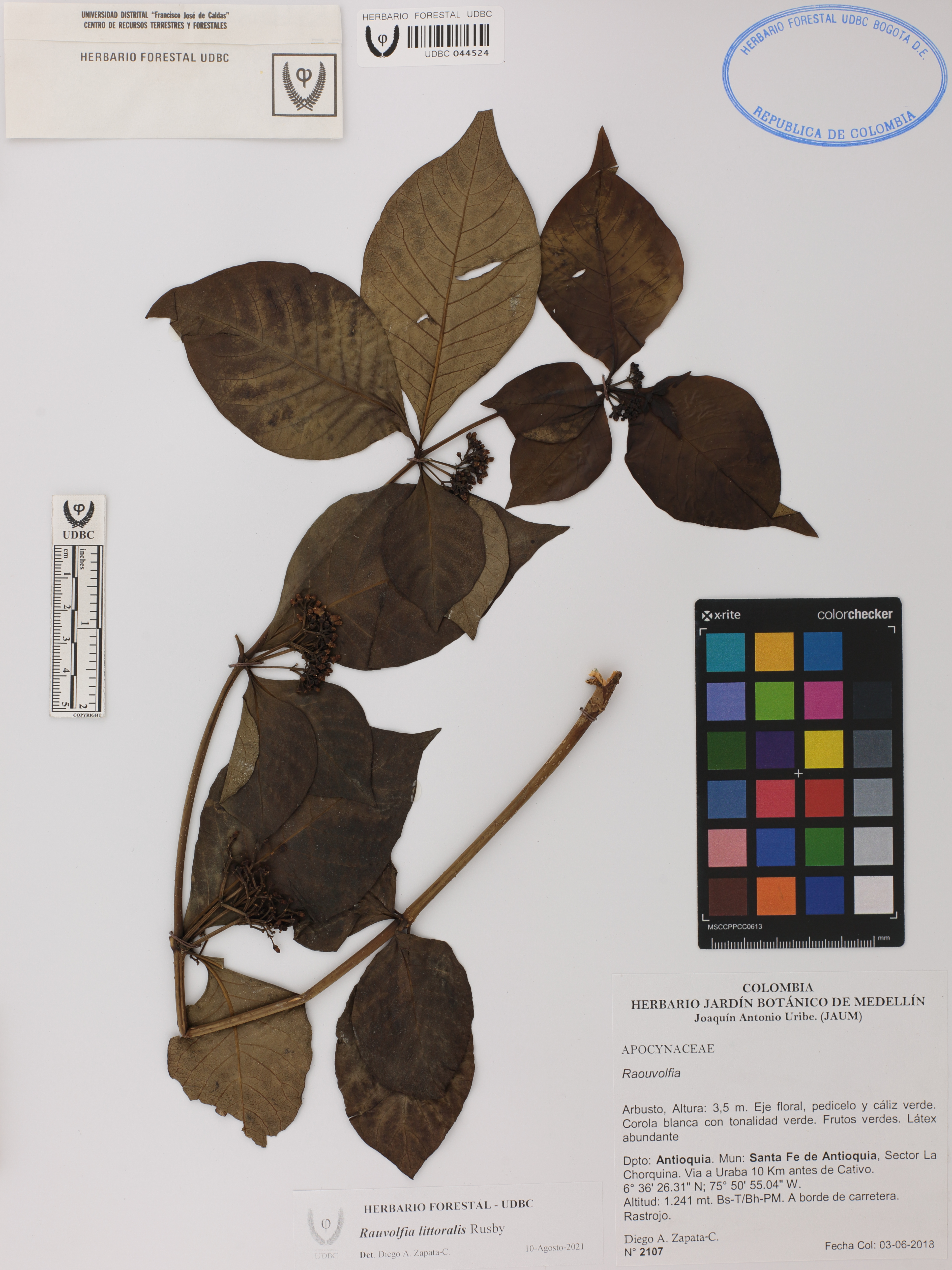 Fotografía del ejemplar Zapata-C., D. 2107, determinado como Rauvolfia littoralis en el año 2021