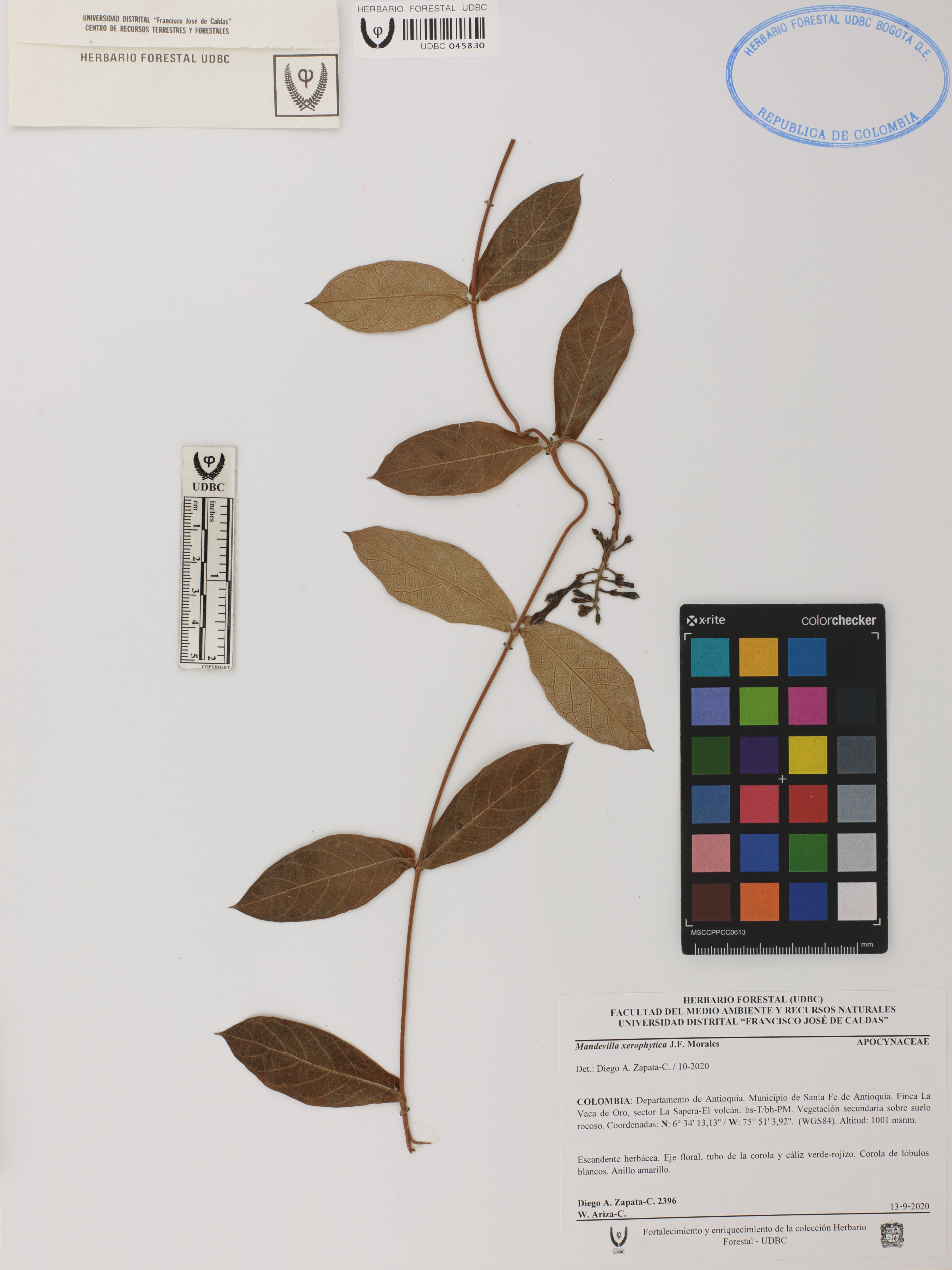 Fotografía del ejemplar Zapata-C., D. 2396, determinado como Mandevilla xerophytica en el año 2020