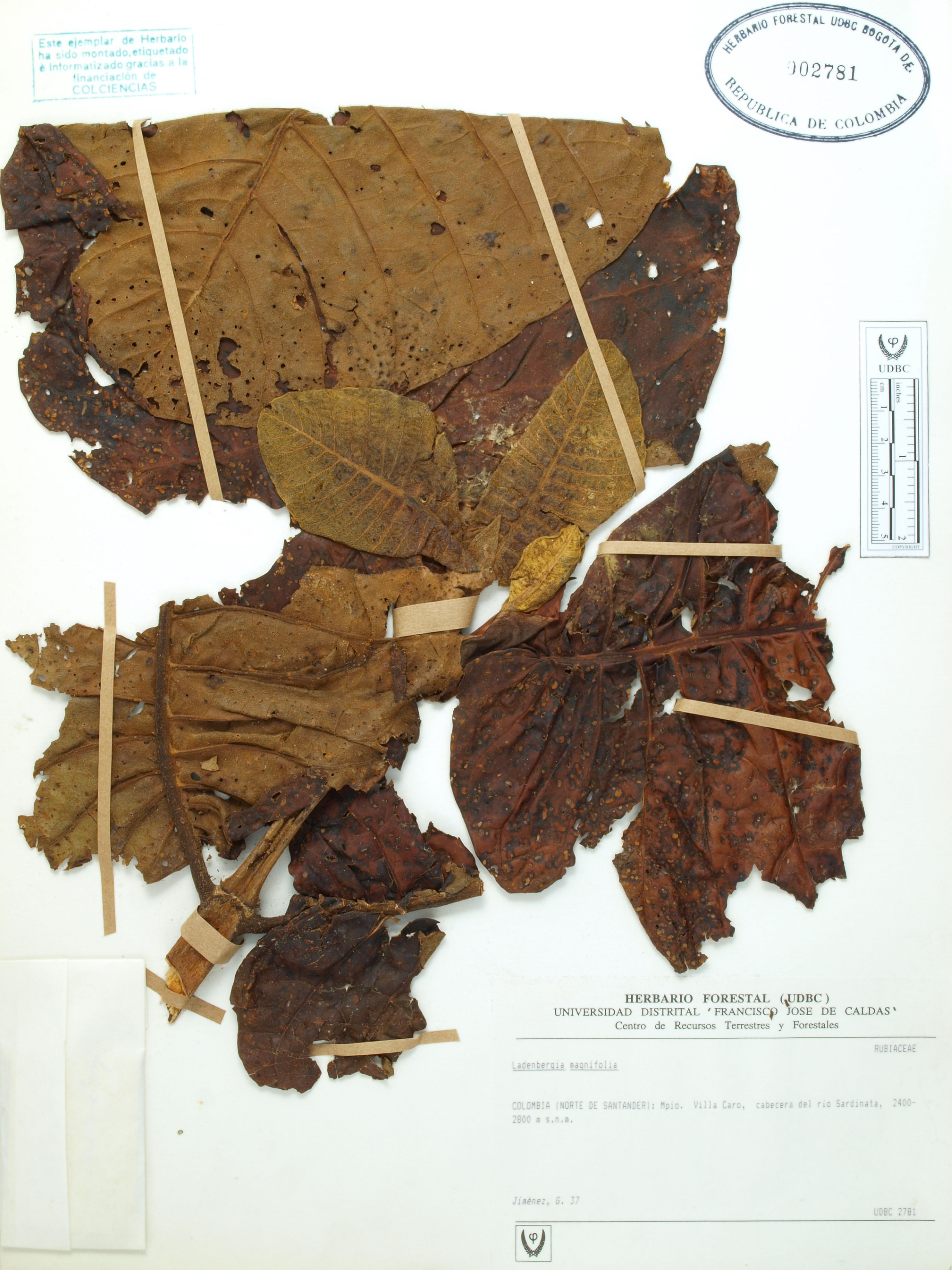 Fotografía del ejemplar Jiménez, G. 37, determinado como Ladenbergia macrocarpa en el año 2022