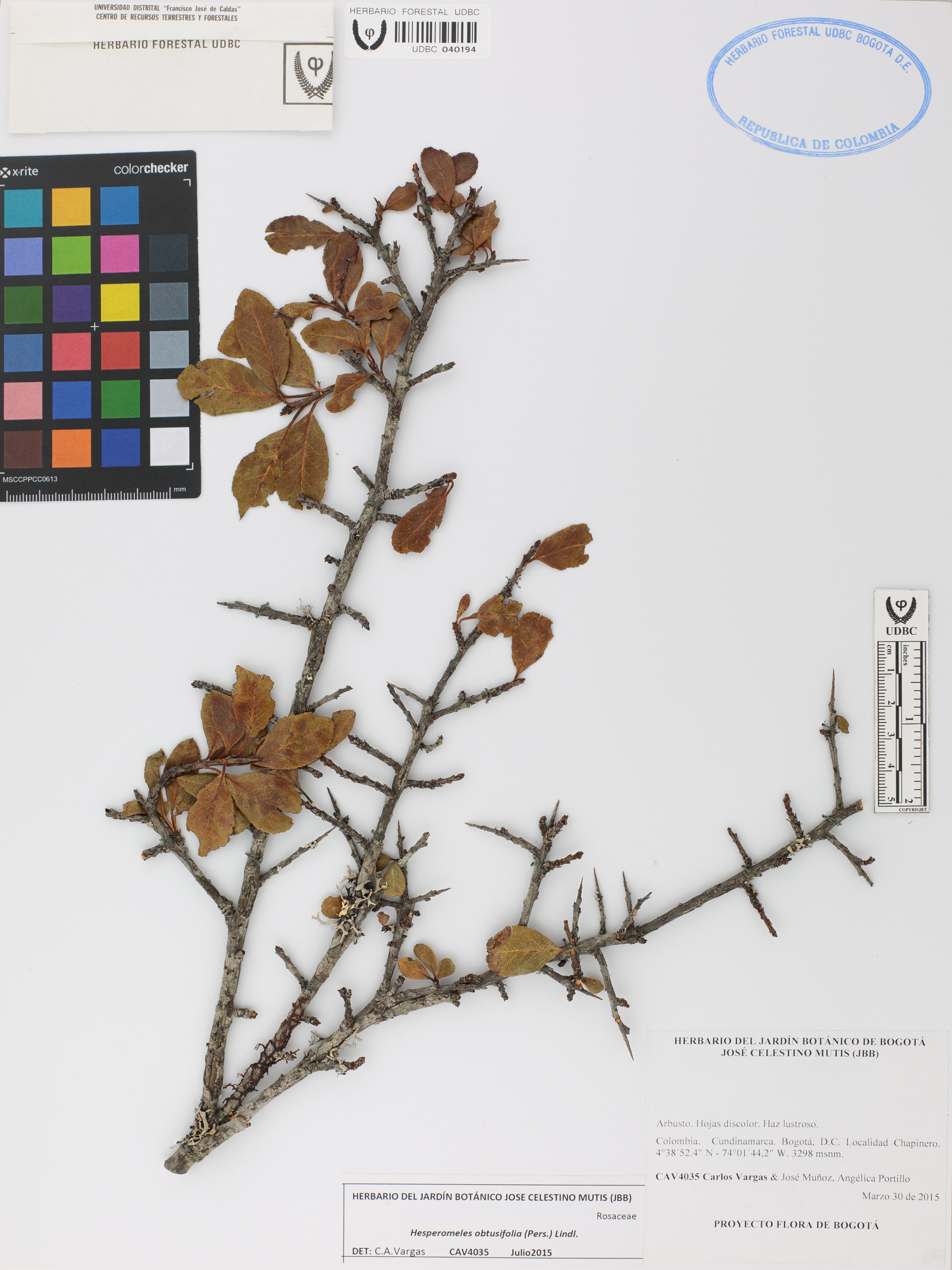 Fotografía del ejemplar Vargas, C. 4035, determinado como Hesperomeles obtusifolia en el año 2015
