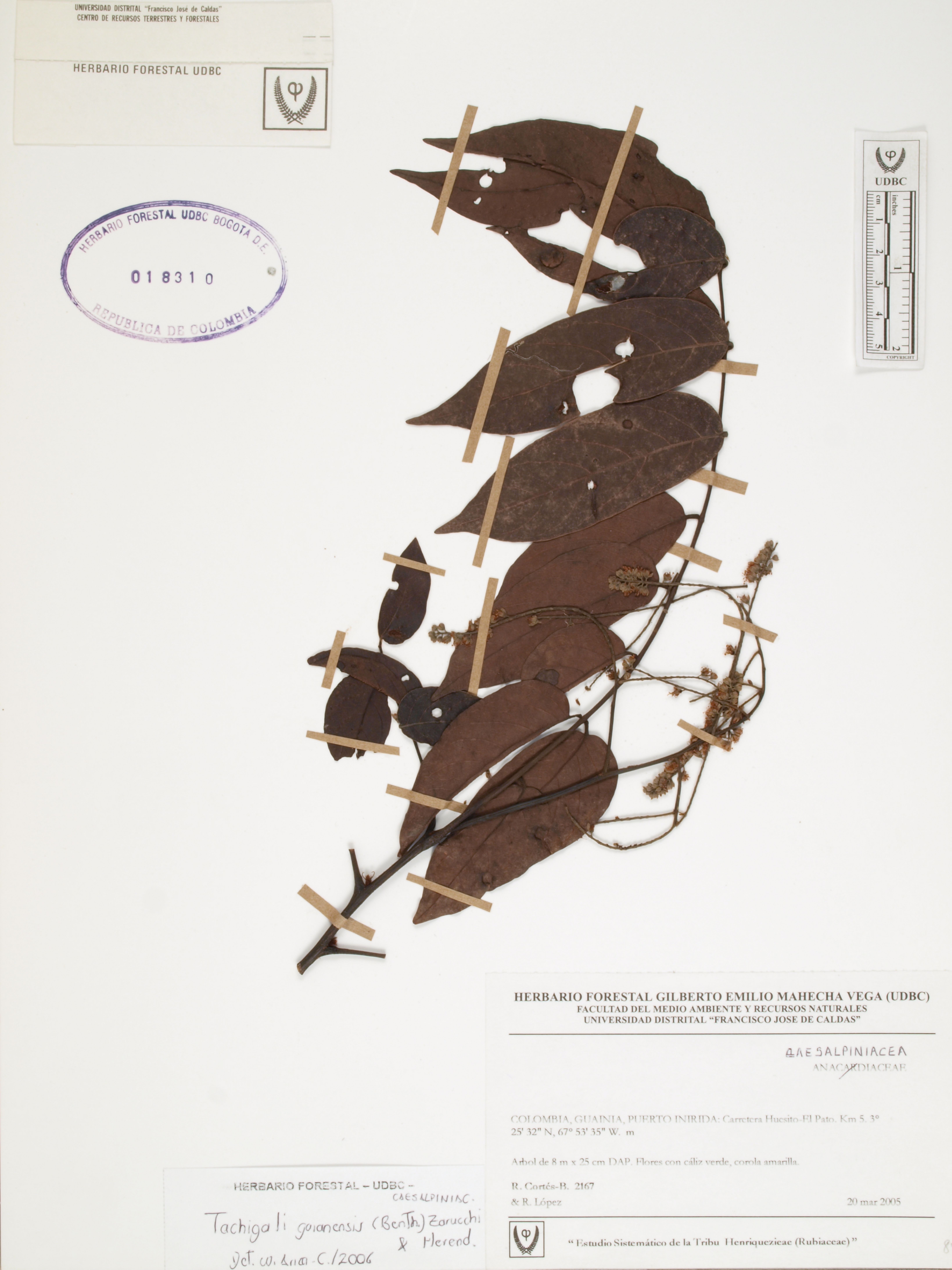 | dc.description | Fotografía del ejemplar Cortés-B., R. 2167, determinado como Tachigali guianensis en el año 2006 | |