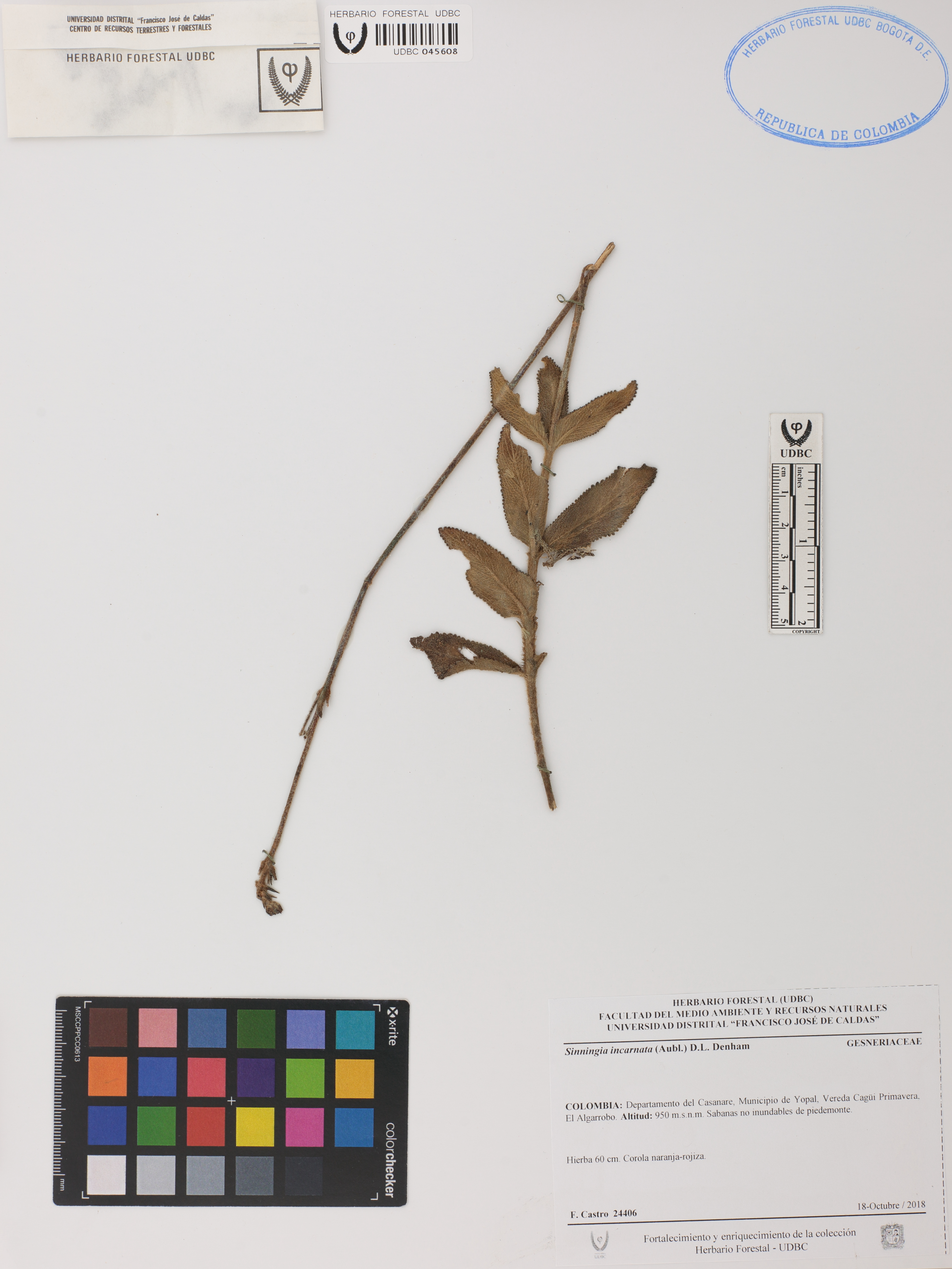 Fotografía del ejemplar Castro, F. 24406, determinado como Sinningia incarnata en el año 2018