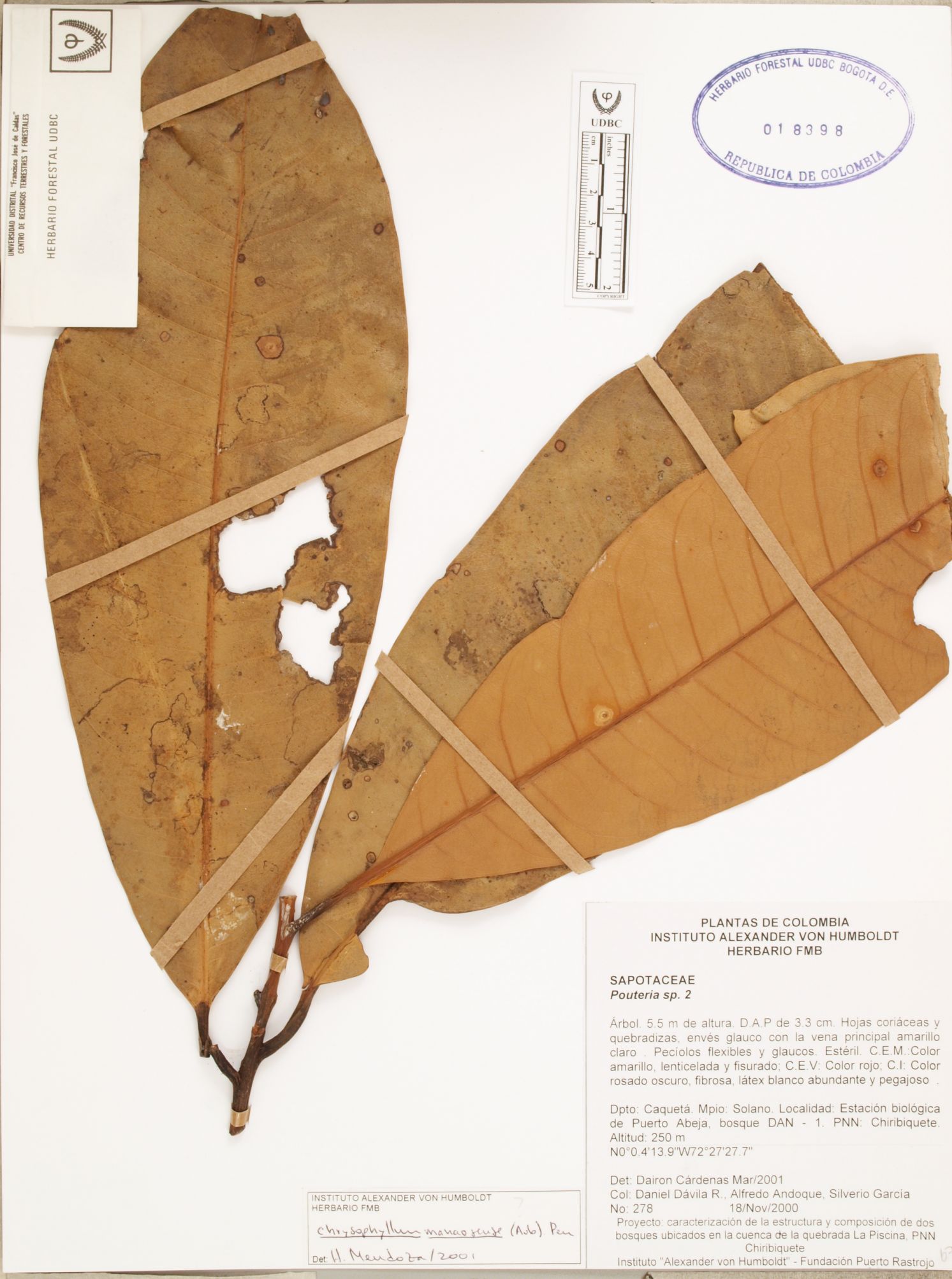 Fotografía del ejemplar Dávila, D. 278, determinado como Chrysophyllum manaosense en el año 2001