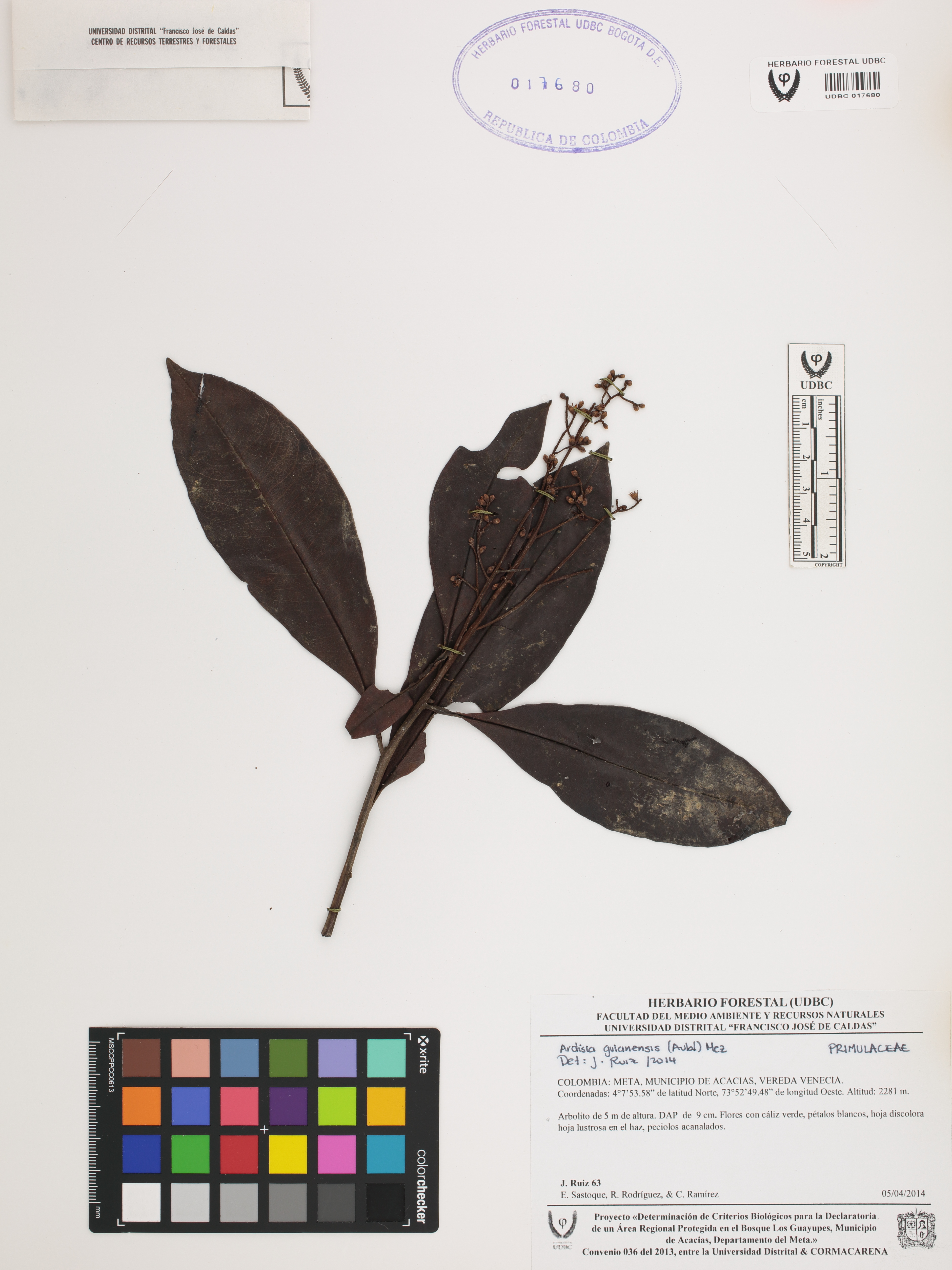 Fotografía del ejemplar Ruiz, J. 63, determinado como Ardisia guianensis en el año 2014