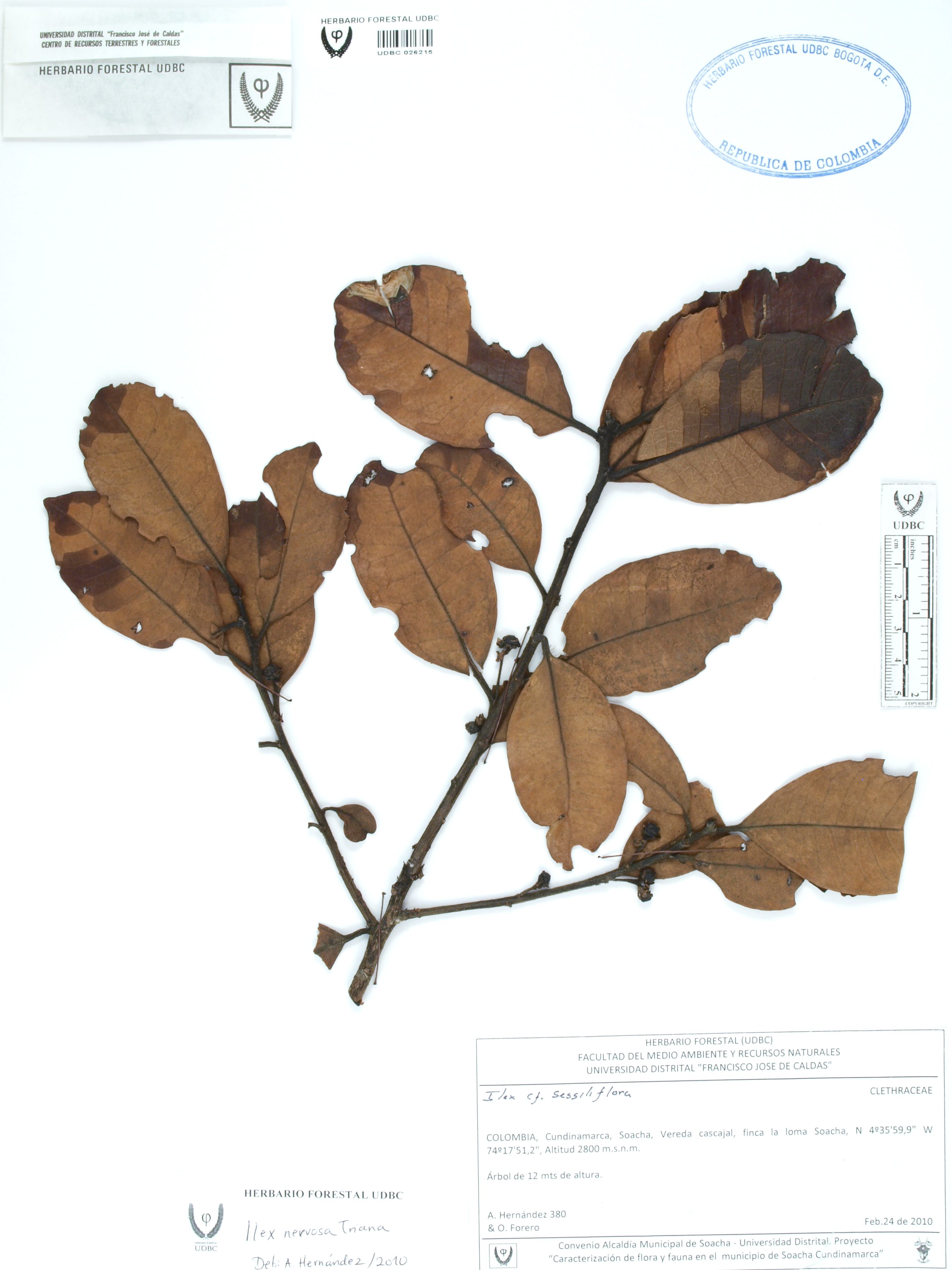 Fotografía del ejemplar Hernández, A. 380, determinado como Ilex nervosa en el año 2010