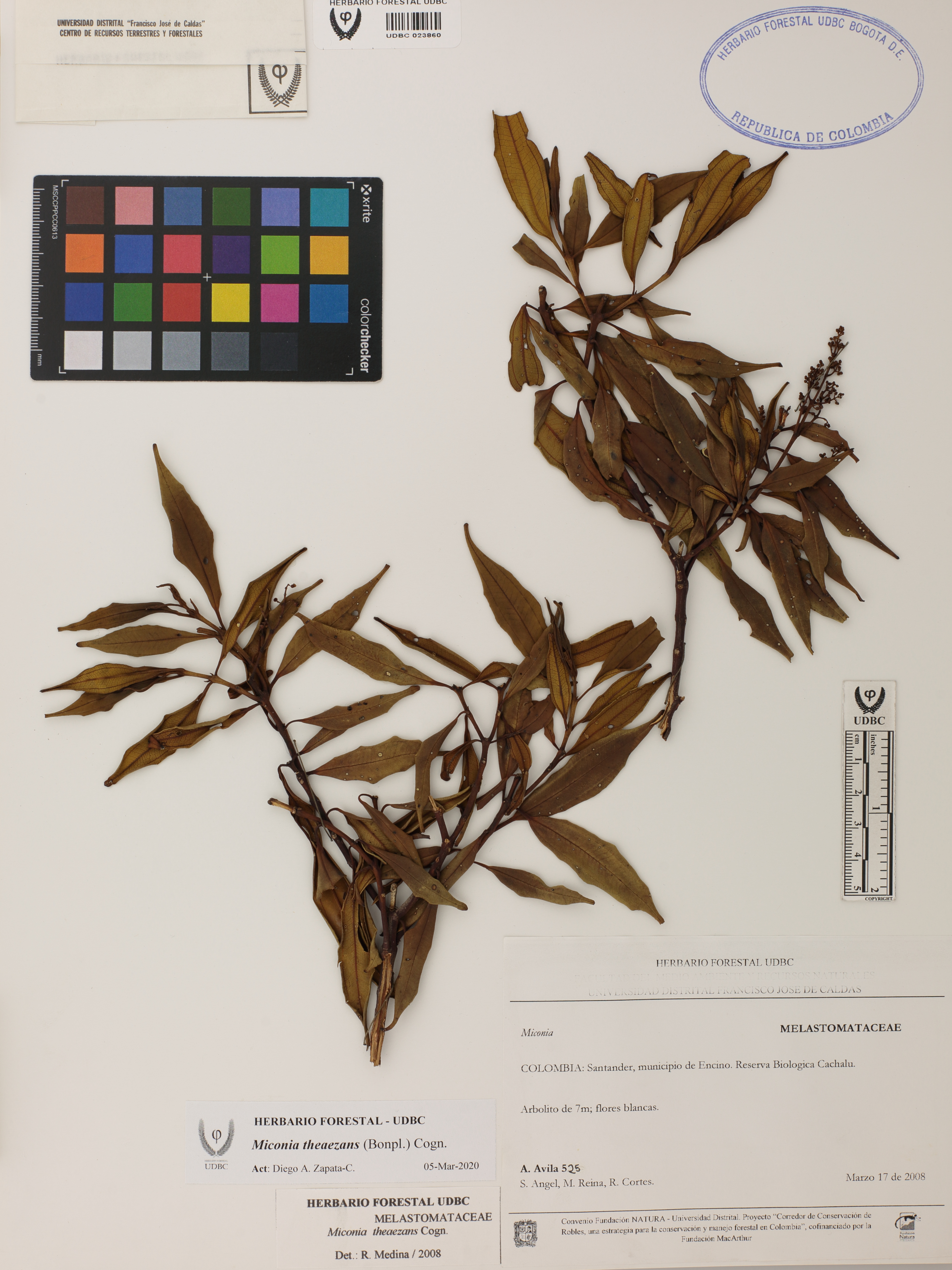 Fotografía del ejemplar Ávila, A. 525, determinado como Miconia theaezans en el año 2008