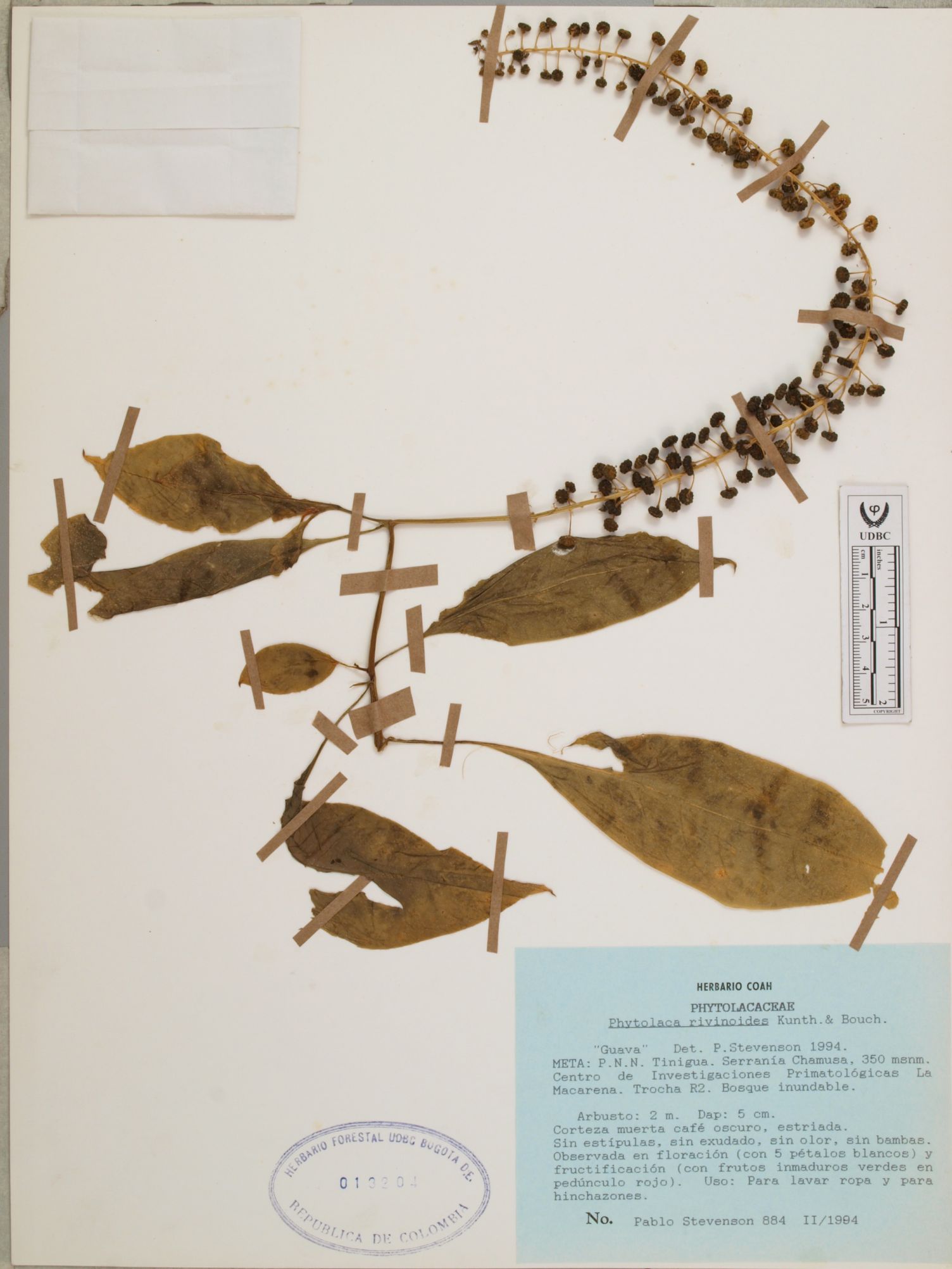 Fotografía del ejemplar Stevenson, P. 884, determinado como Phytolacca rivinoides en el año 1994