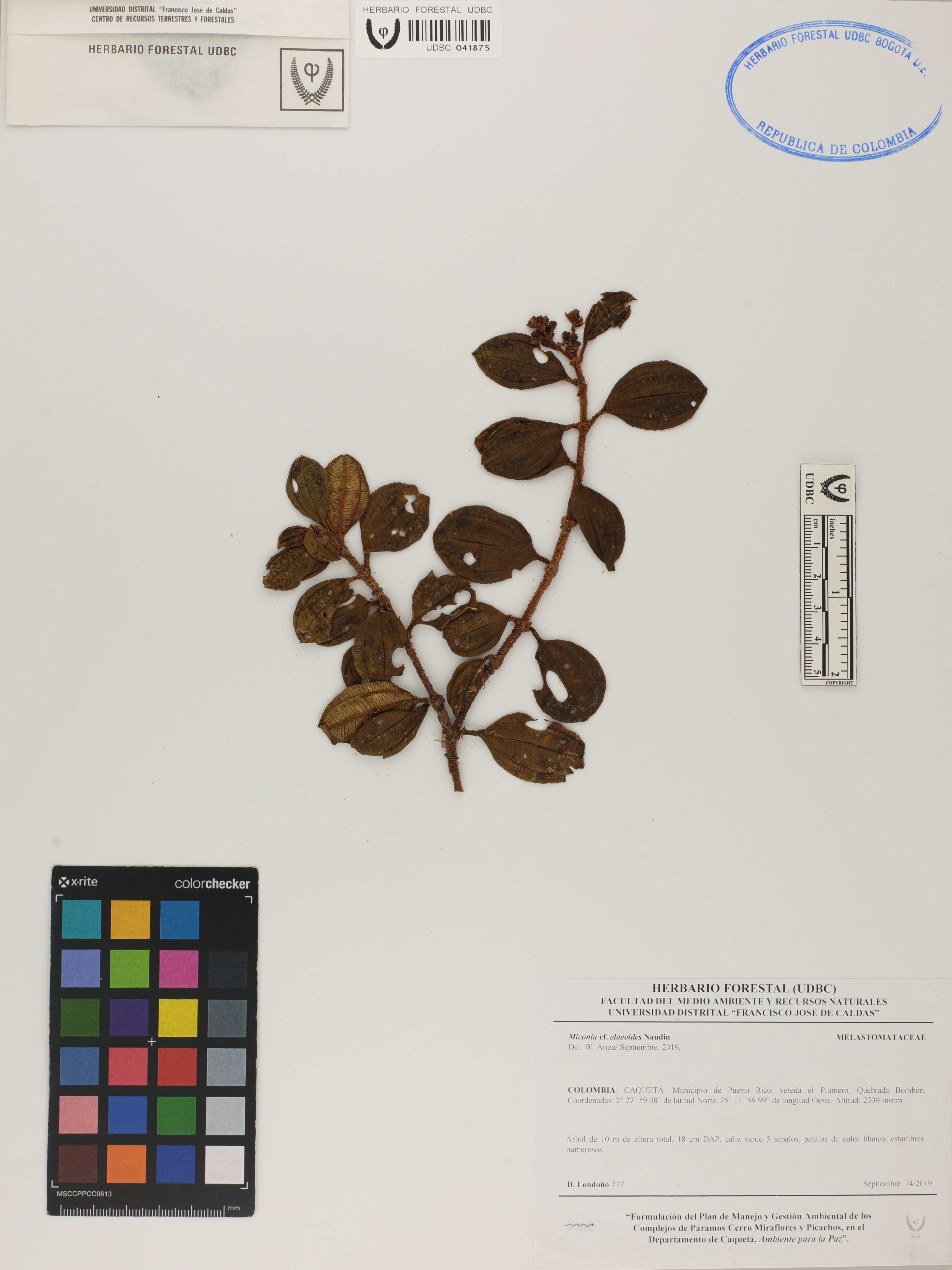Fotografía del ejemplar Londoño, D. 777, determinado como Miconia elaeoides en el año 2019