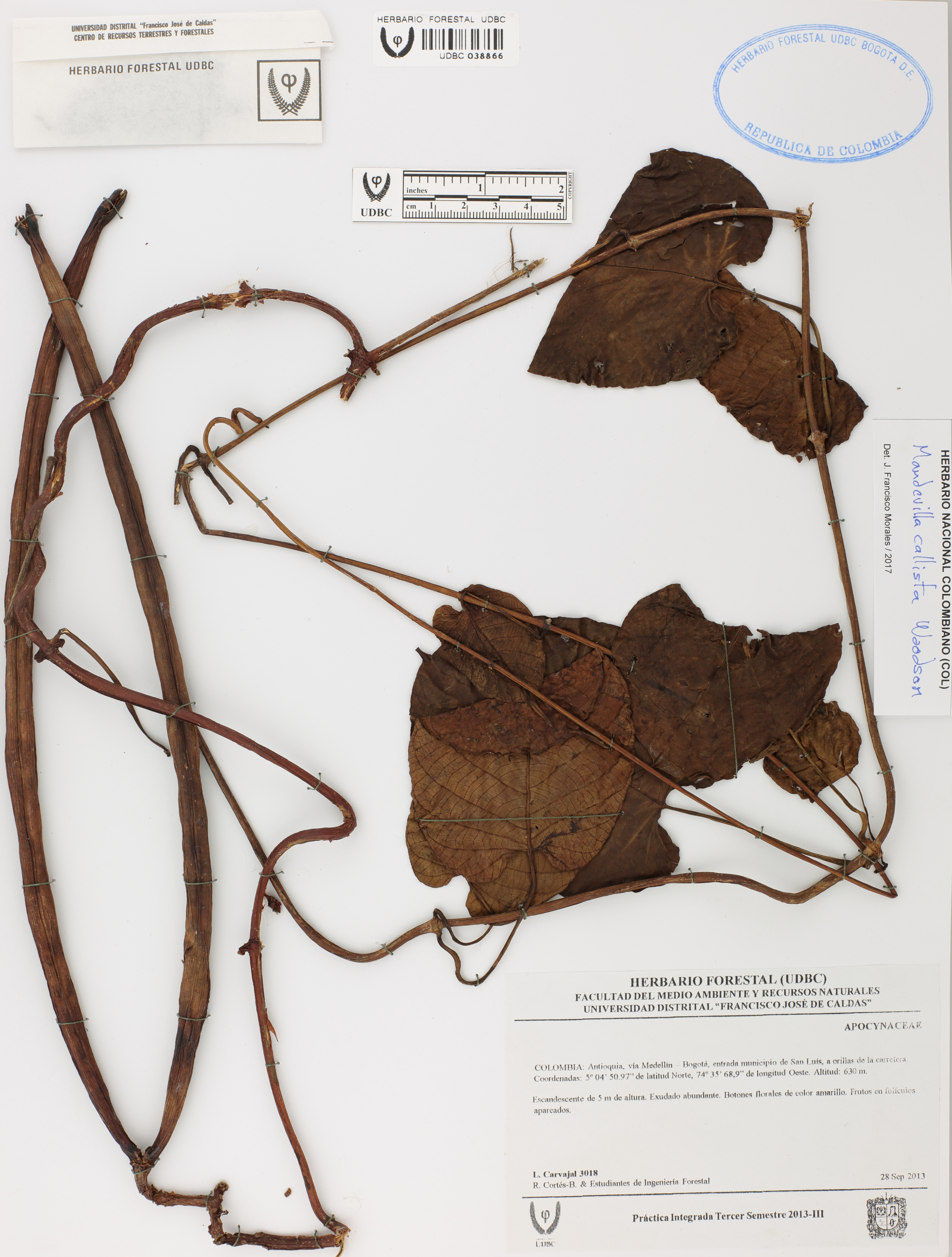 Fotografía del ejemplar Carvajal, L. 3018, determinado como Mandevilla callista en el año 2017