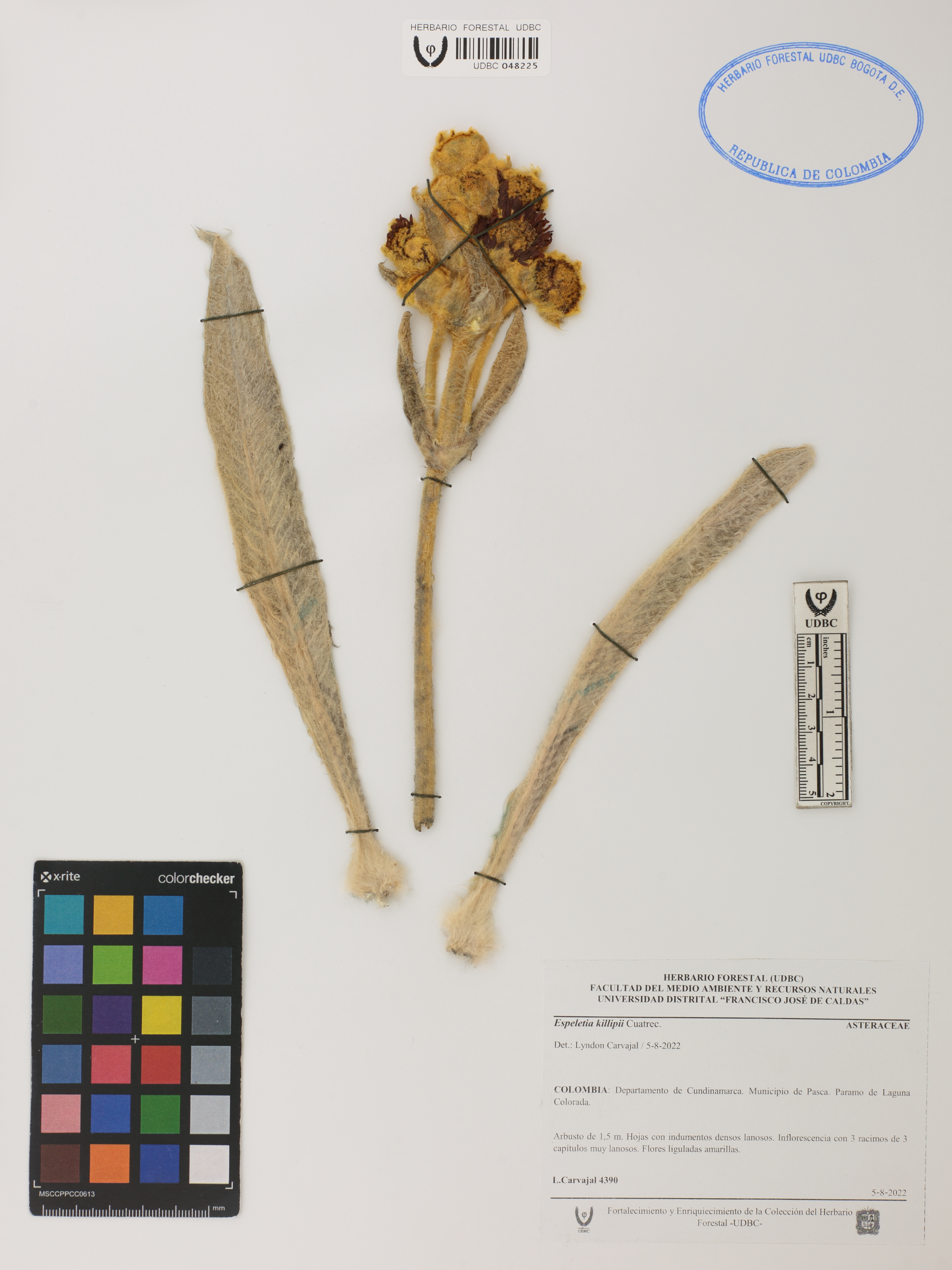 Fotografía del ejemplar Carvajal, L. 4390, determinado como Espeletia killipii en el año 2022