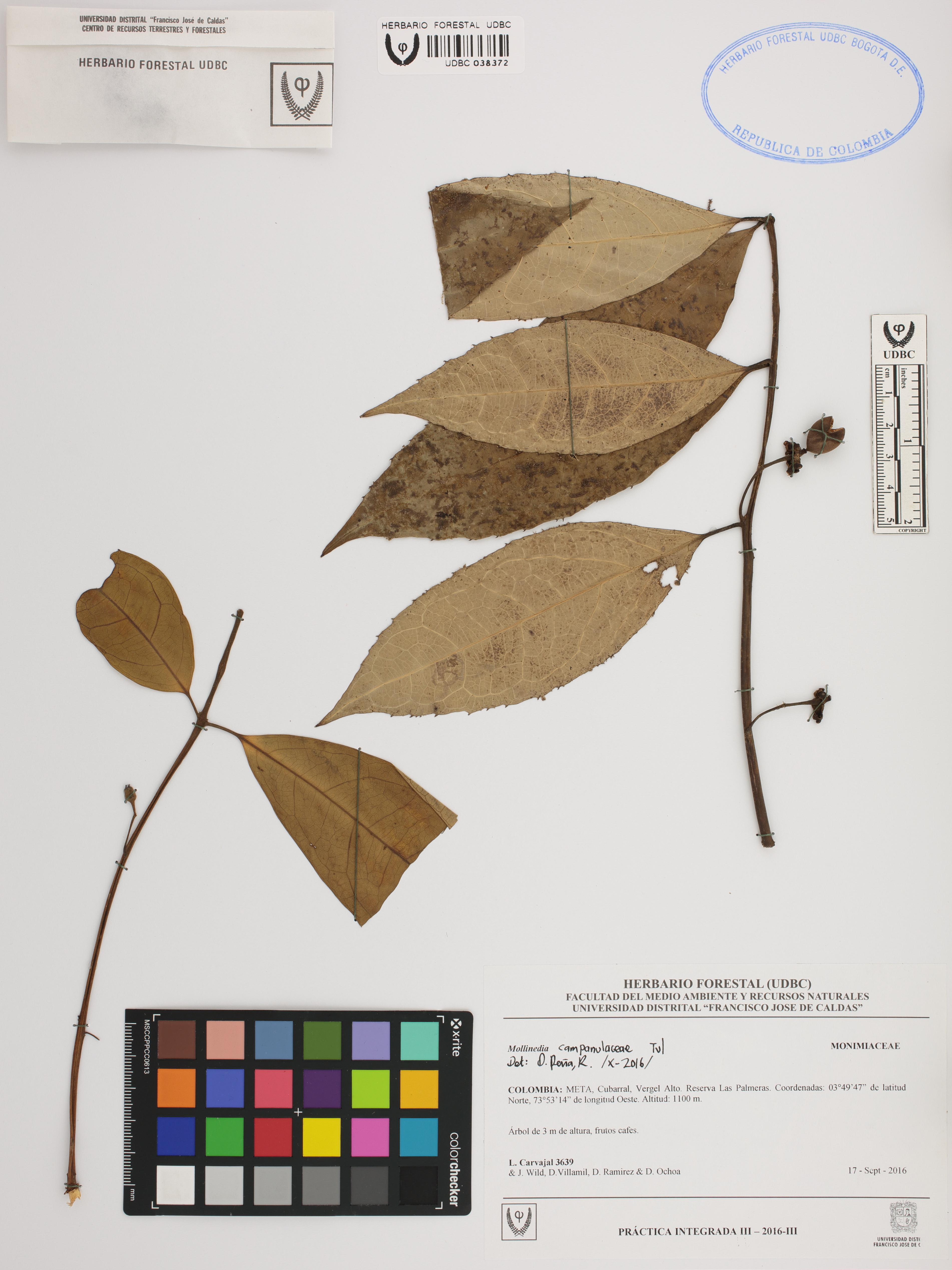 Fotografía del ejemplar Carvajal, L. 3639, determinado como Mollinedia campanulacea en el año 2016