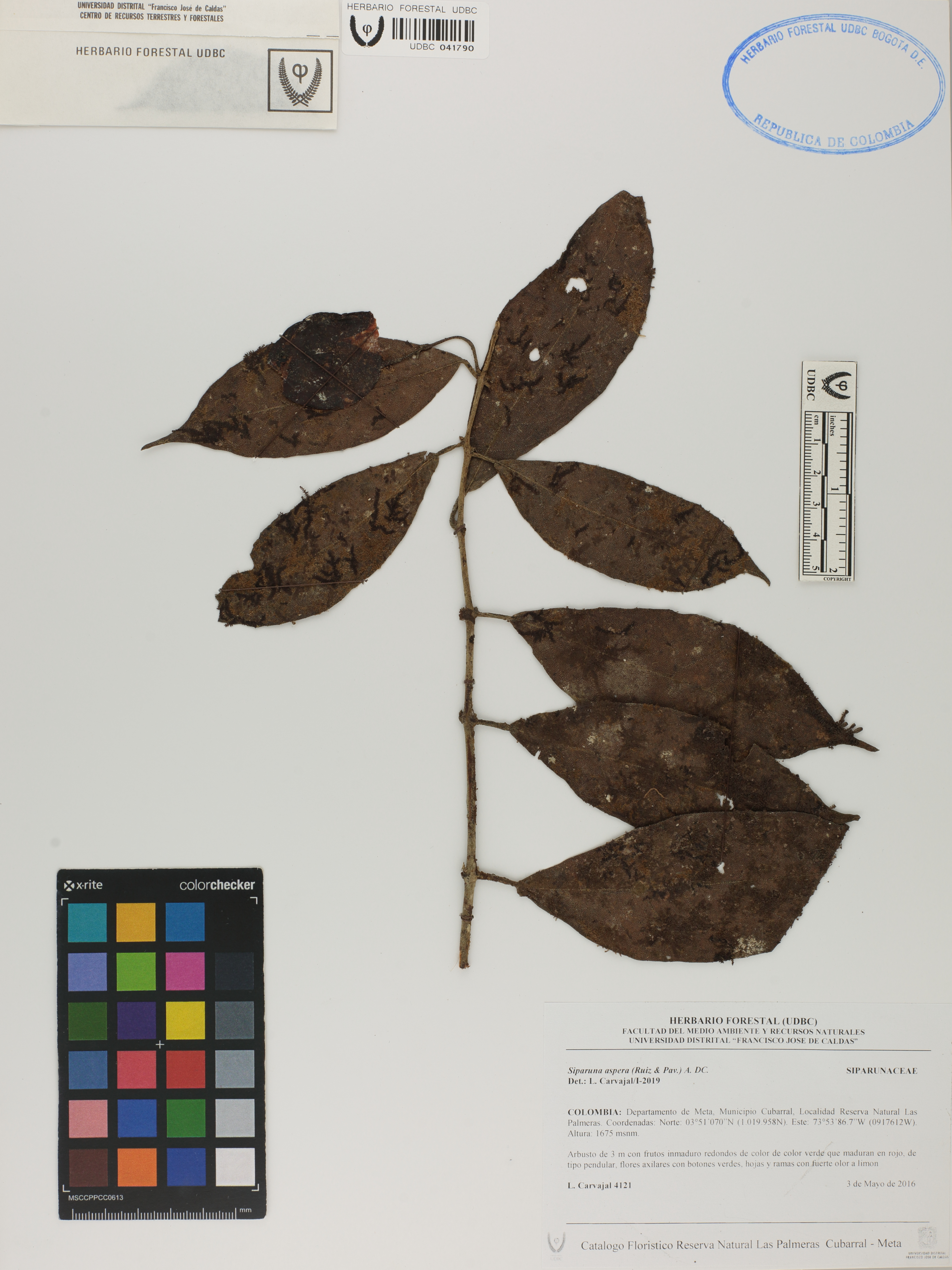 Fotografía del ejemplar Carvajal, L. 4121, determinado como Siparuna aspera en el año 2019