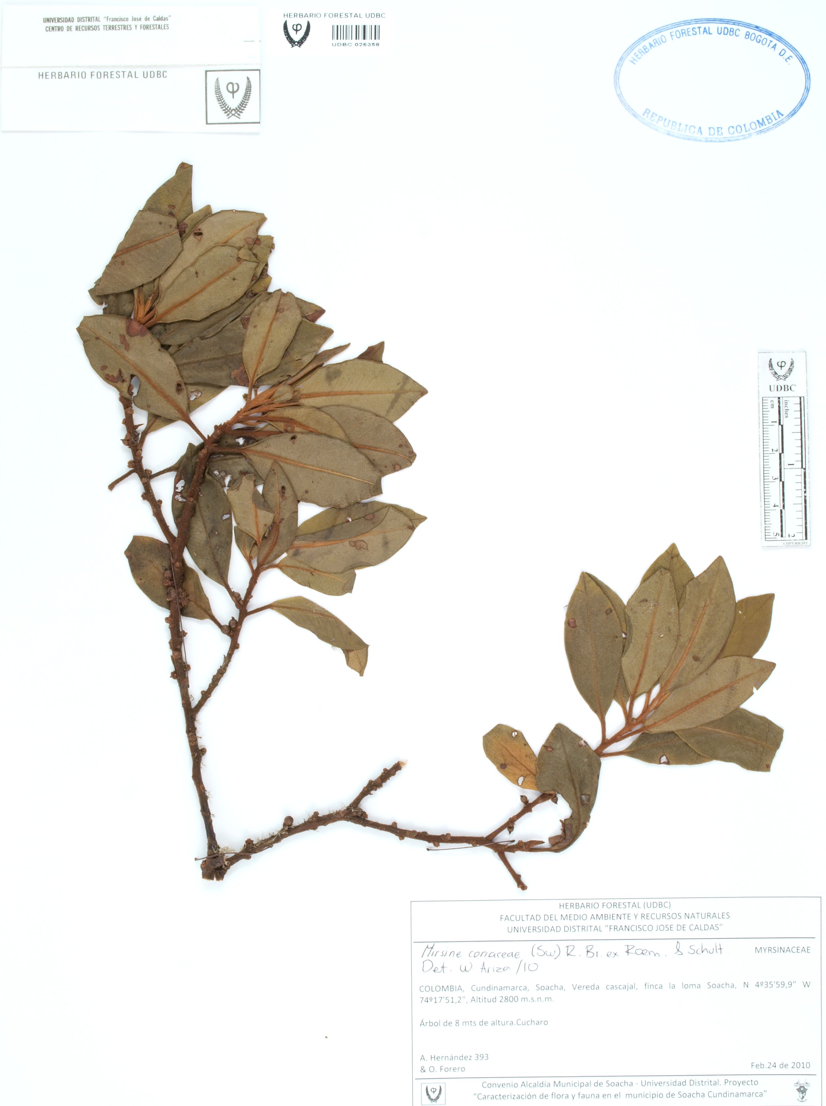 Fotografía del ejemplar Hernández, A. 393, determinado como Myrsine coriacea en el año 2010