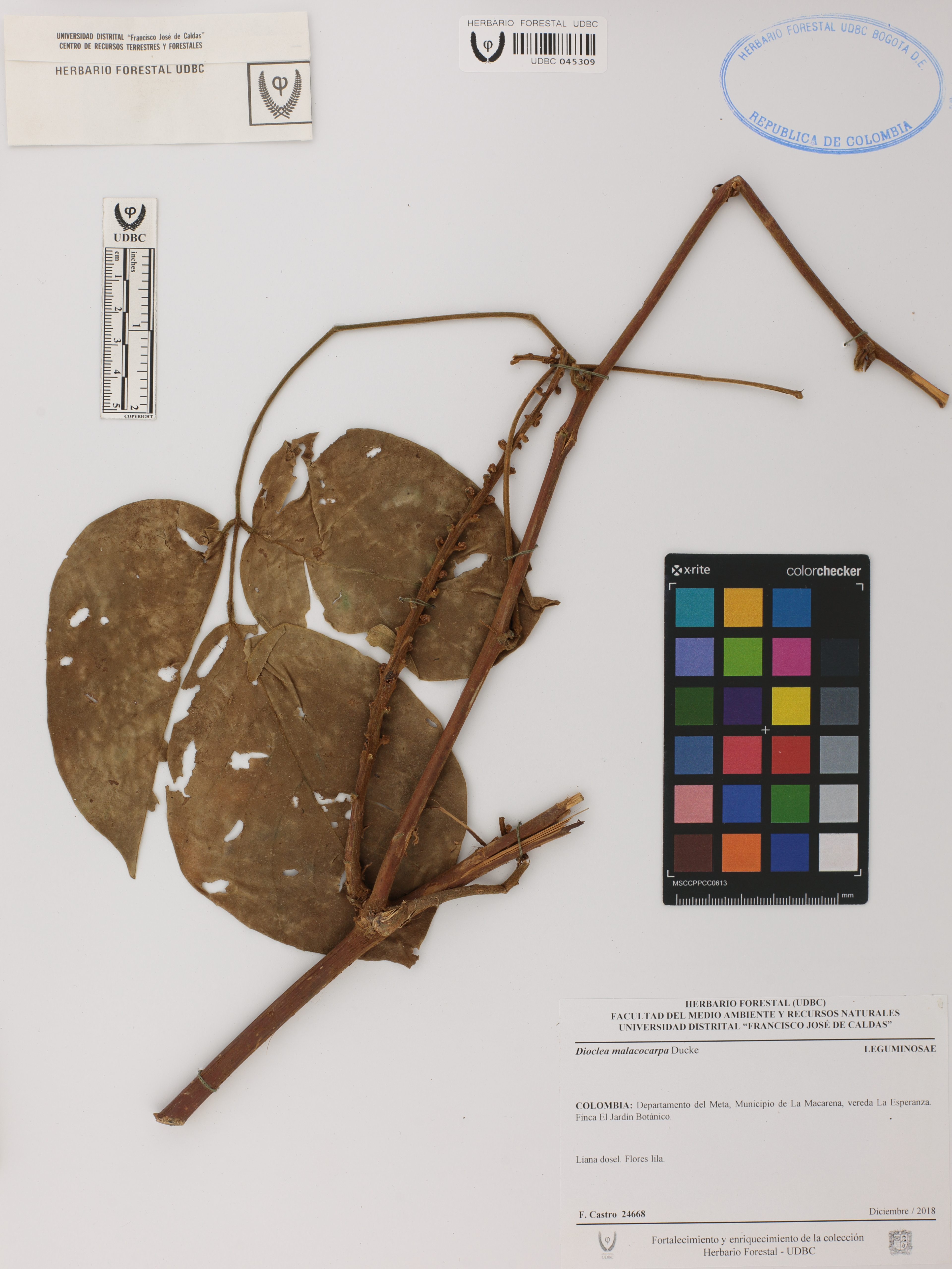 Fotografía del ejemplar Castro, F. 24668, determinado como Dioclea malacocarpa en el año 2018