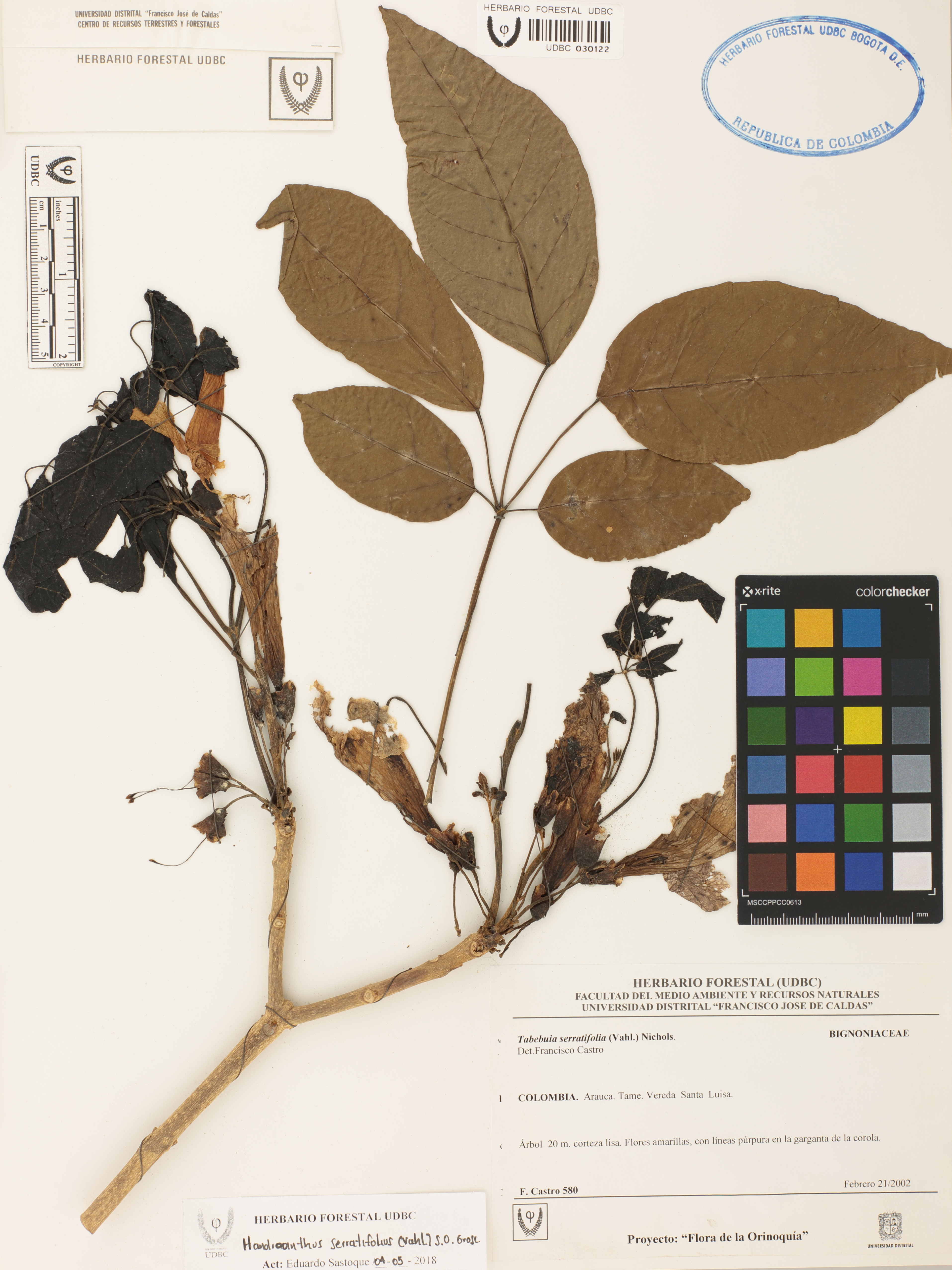 Fotografía del ejemplar Castro, F. 580, determinado como Handroanthus serratifolius en el año 2002