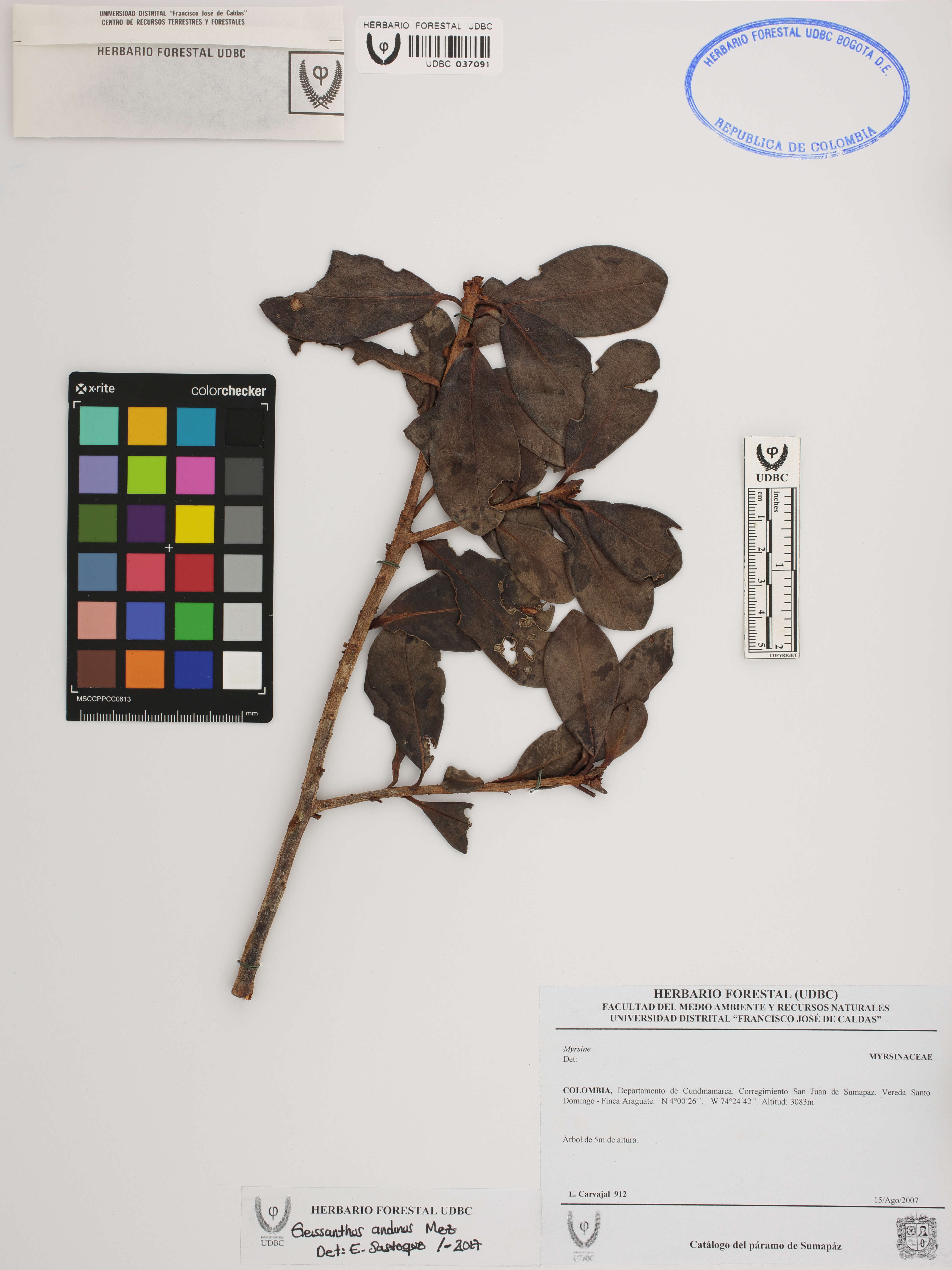 Fotografía del ejemplar Carvajal, L. 912, determinado como Geissanthus andinus en el año 2017