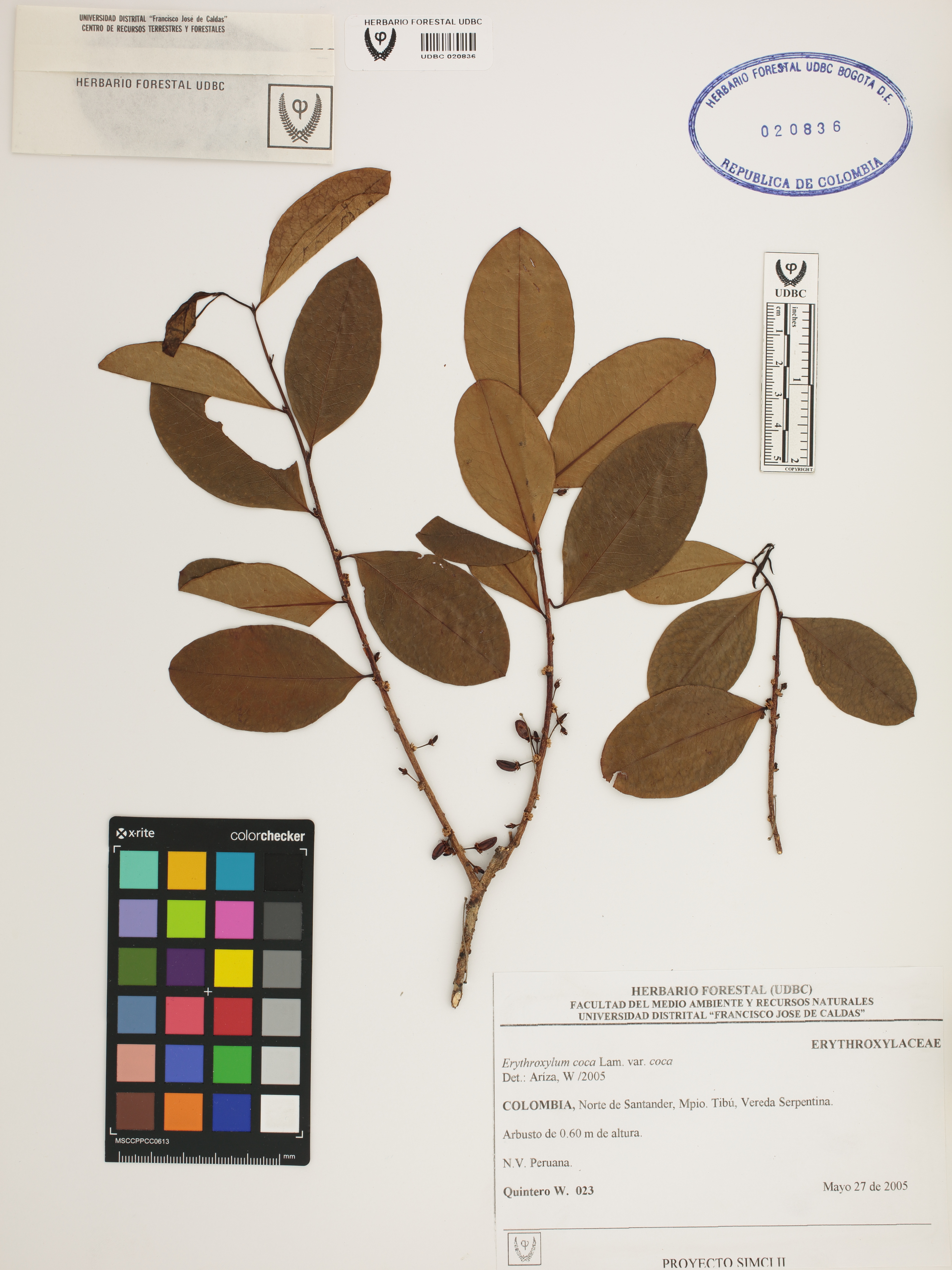 Fotografía del ejemplar Quintero, W. 23, determinado como Erythroxylum coca var. coca en el año 2005