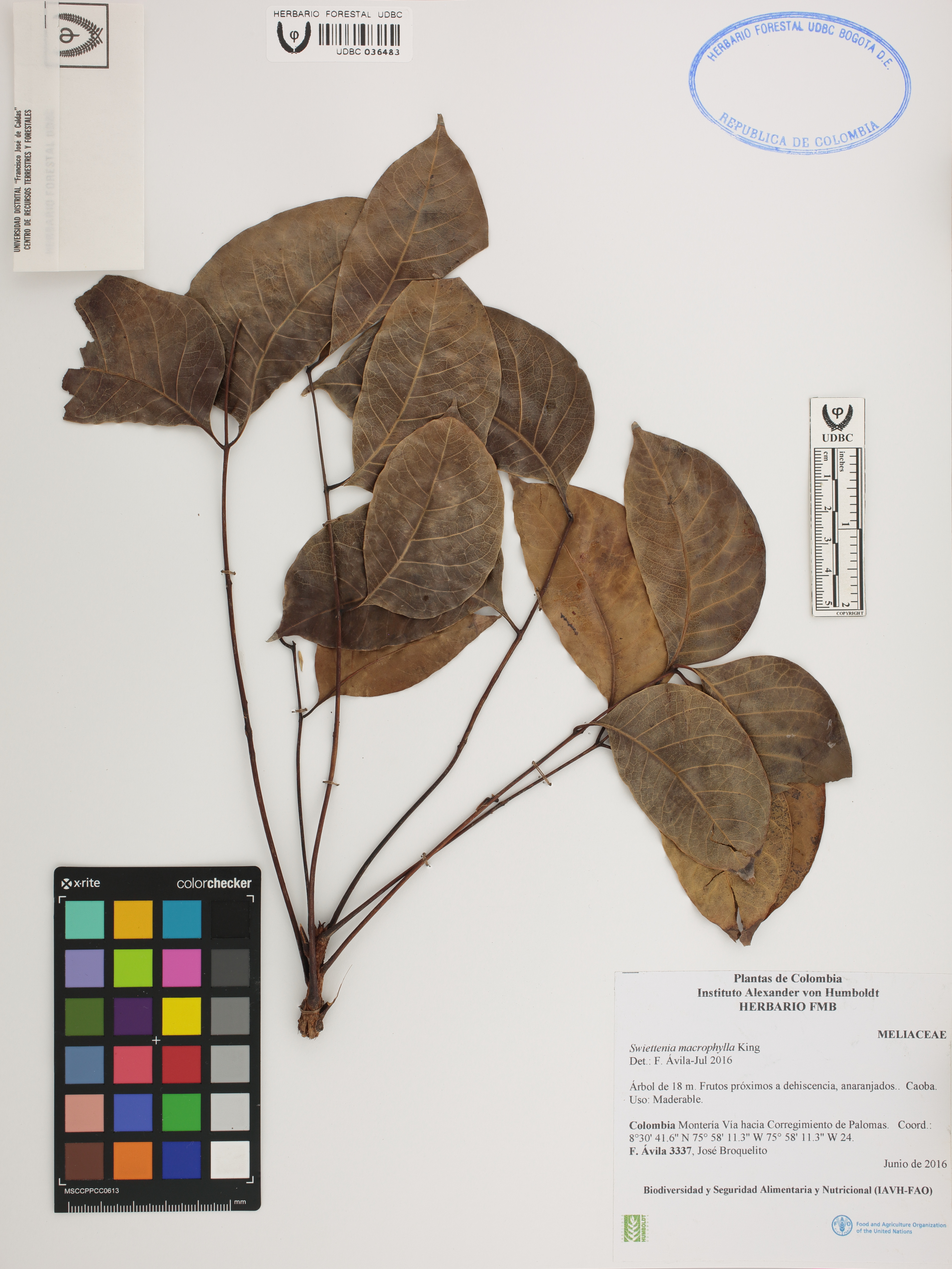 Fotografía del ejemplar Ávila, F. 3337, determinado como Swietenia macrophylla en el año 2016