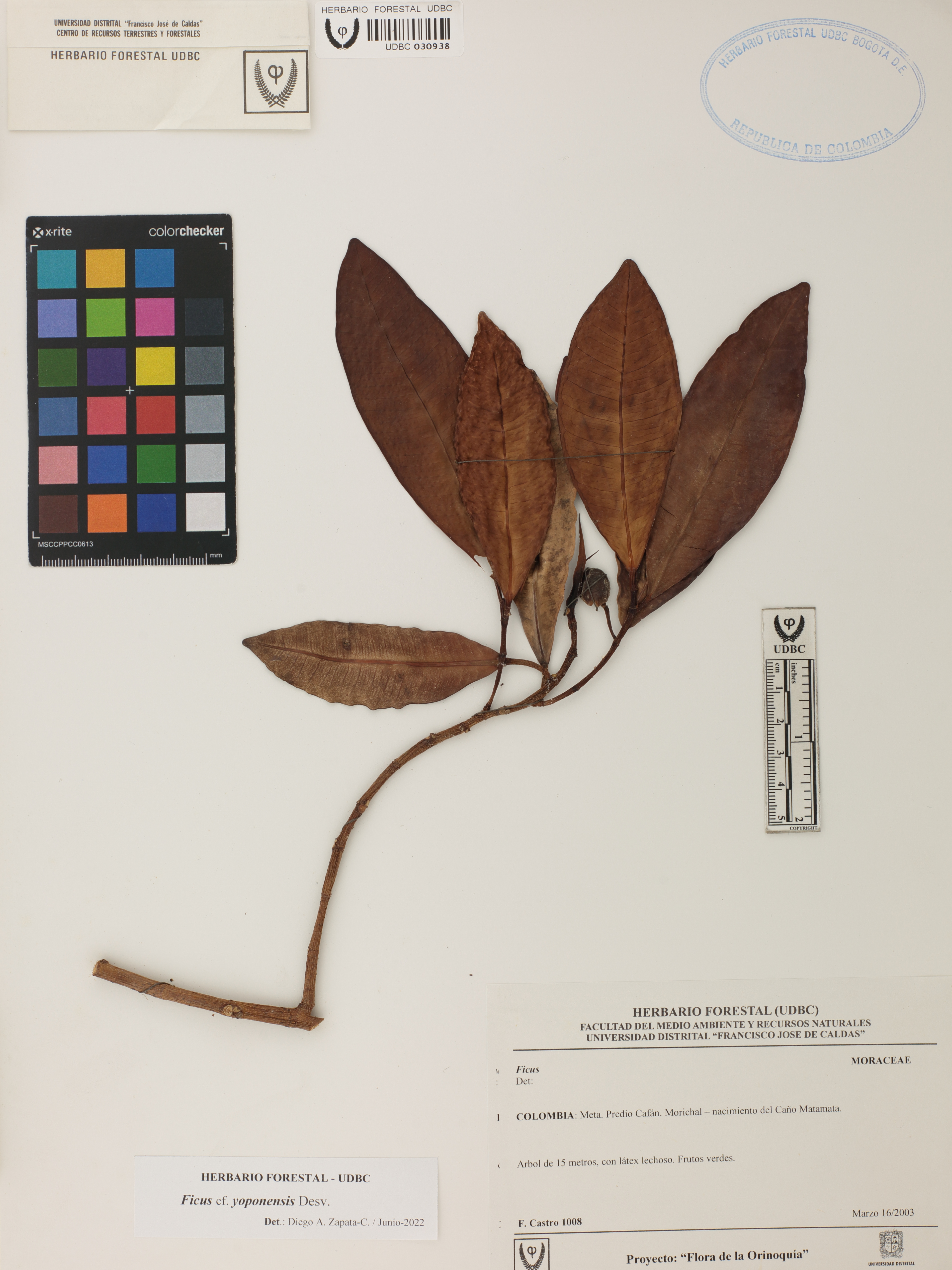 Fotografía del ejemplar Castro, F. 1008, determinado como Ficus yoponensis en el año 2022