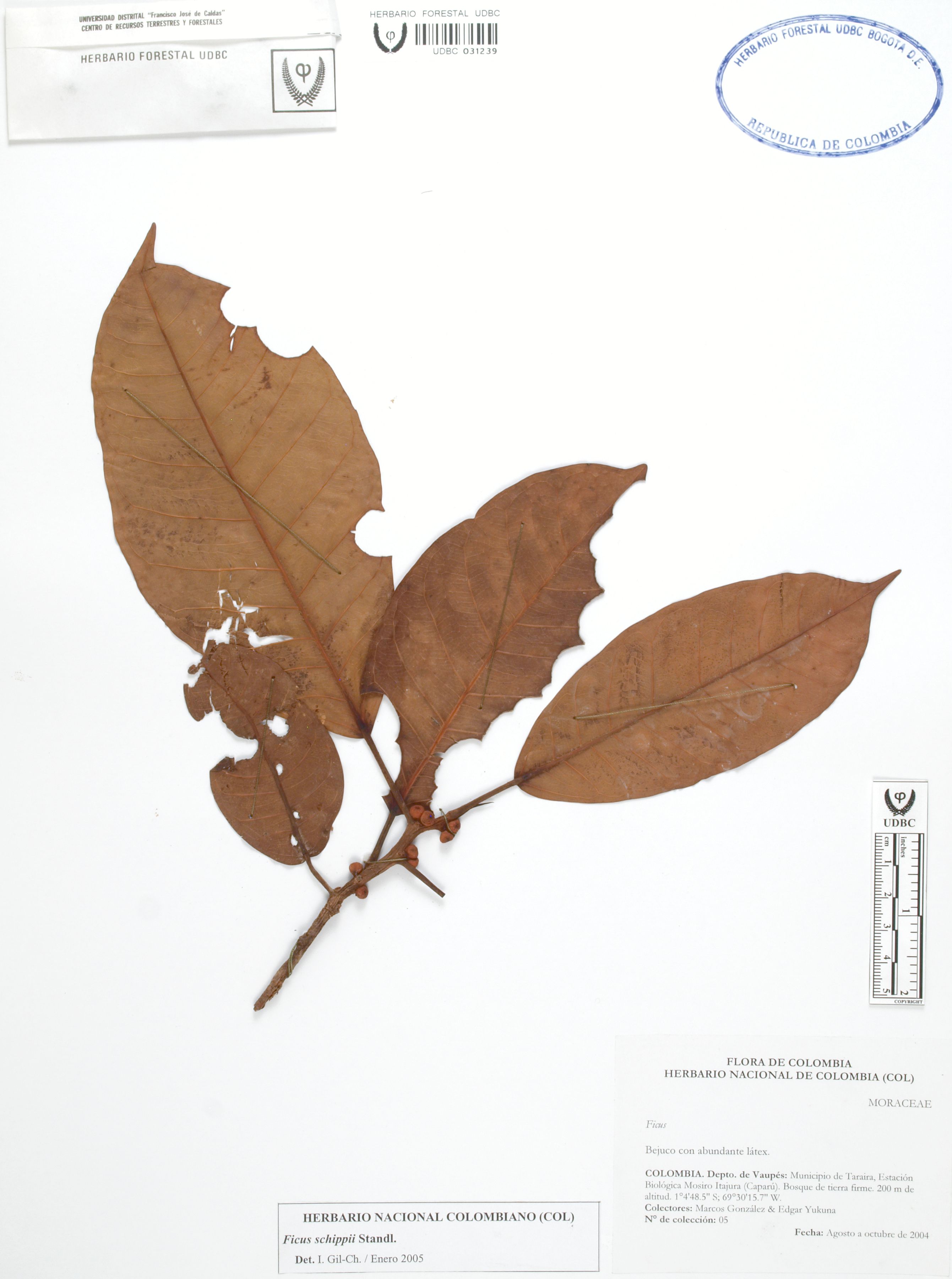 Fotografía del ejemplar González, M. 5, determinado como Ficus schippii en el año 2005