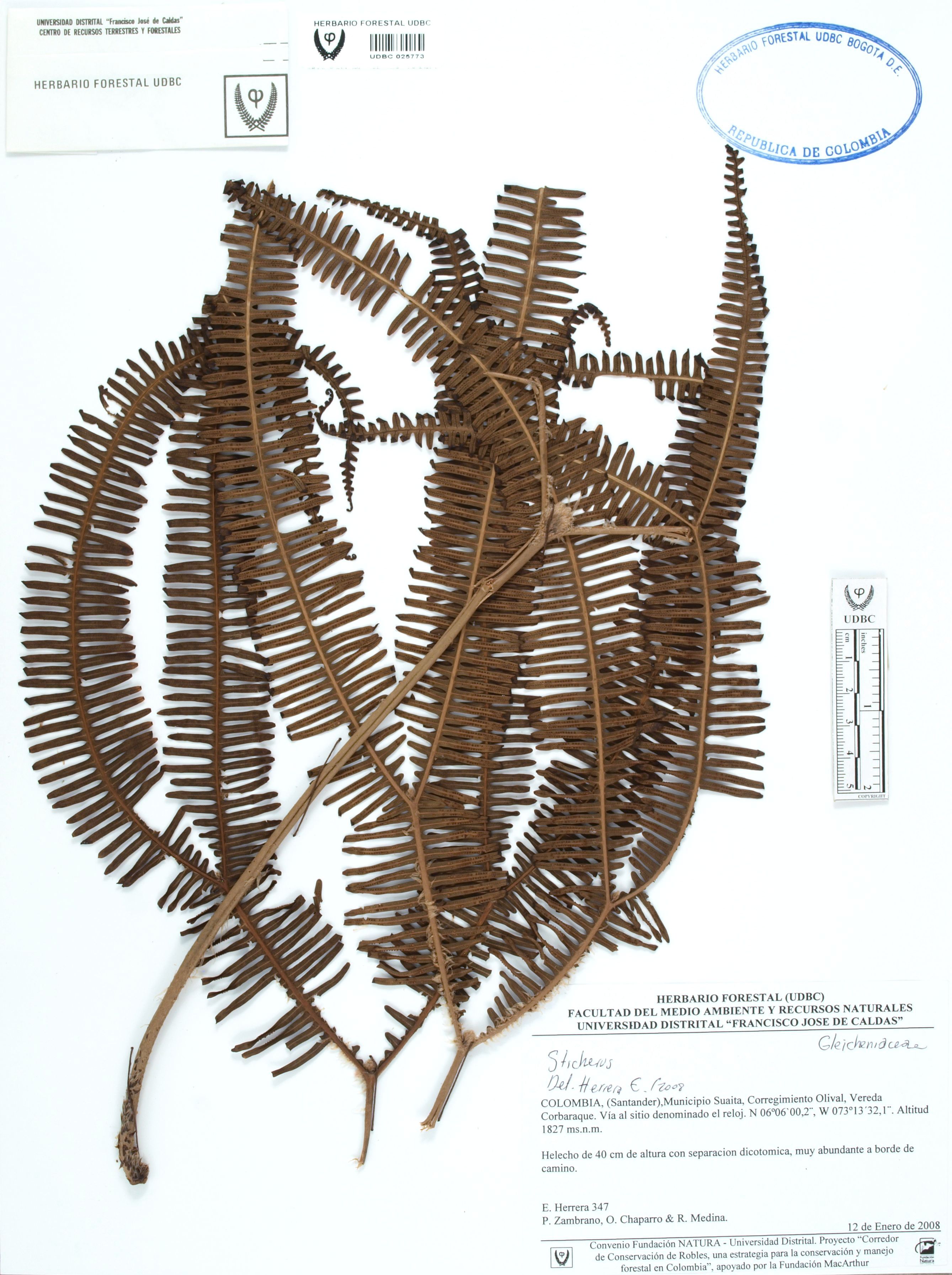 Fotografía del ejemplar Herrera, E. 347, determinado como Sticherus sp. en el año 2008