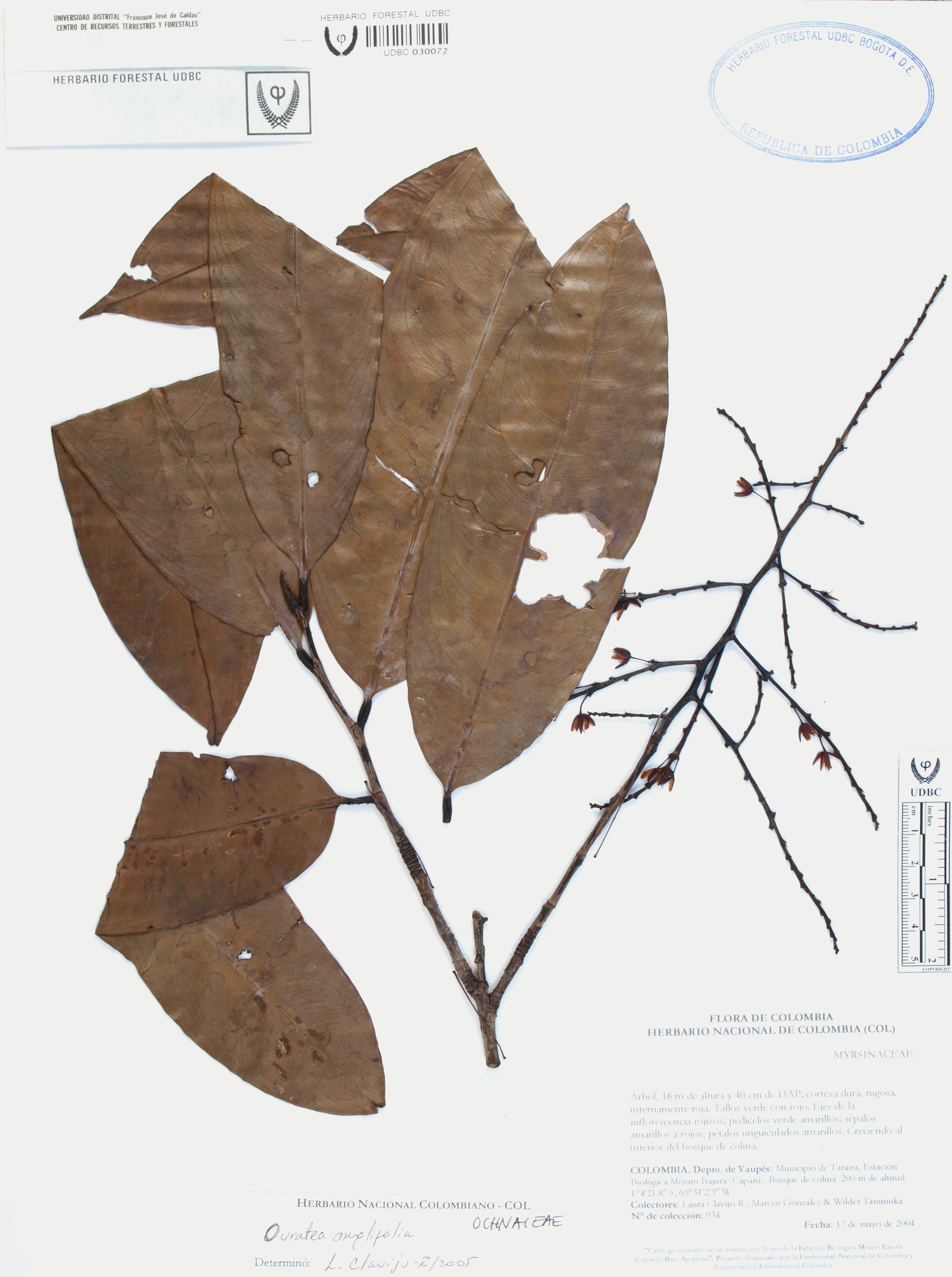 Fotografía del ejemplar Clavijo-R., L. 934, determinado como Ouratea amplifolia en el año 2005