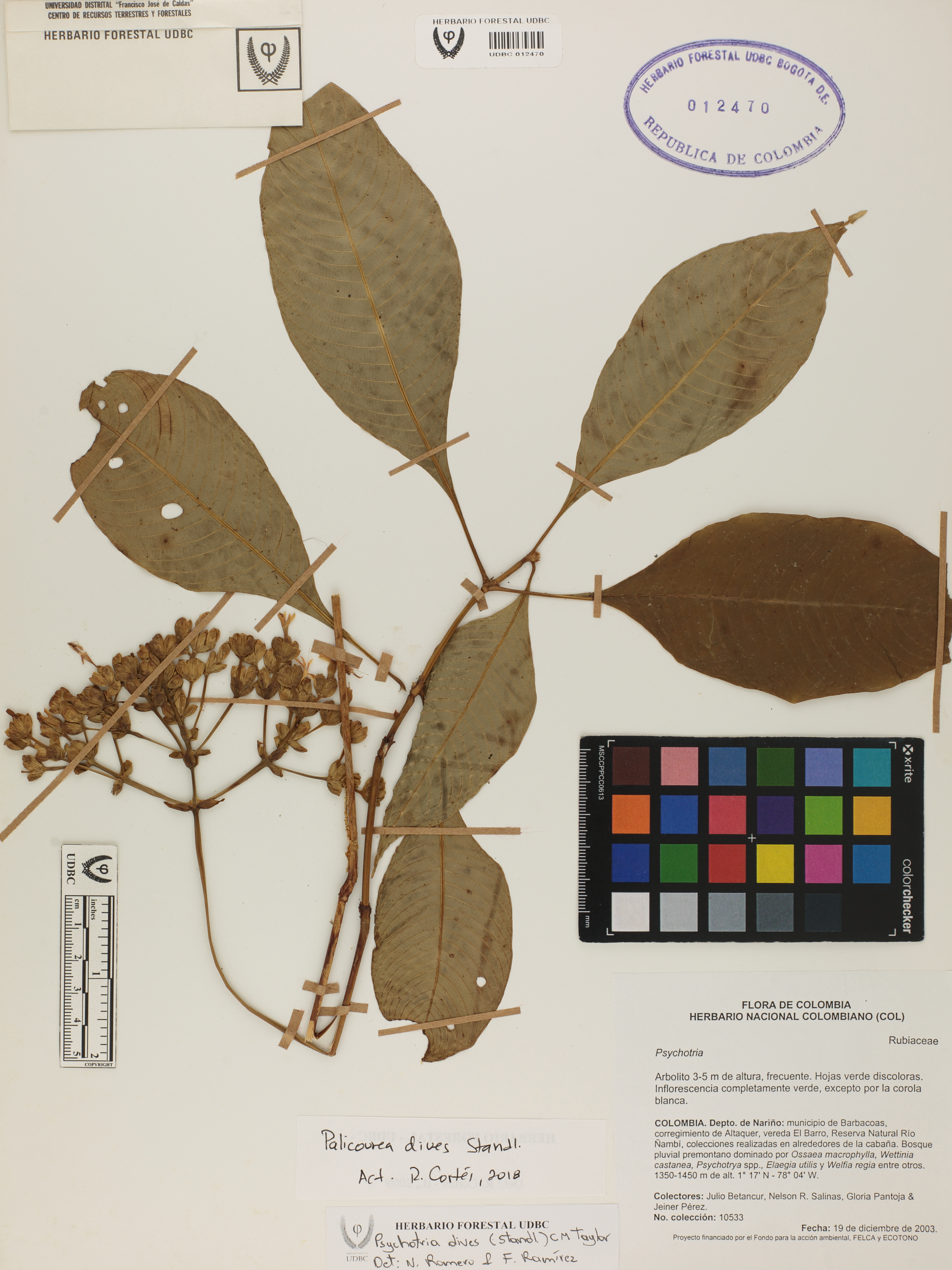 Fotografía del ejemplar Betancur, J. 10533, determinado como Palicourea dives en el año 2018