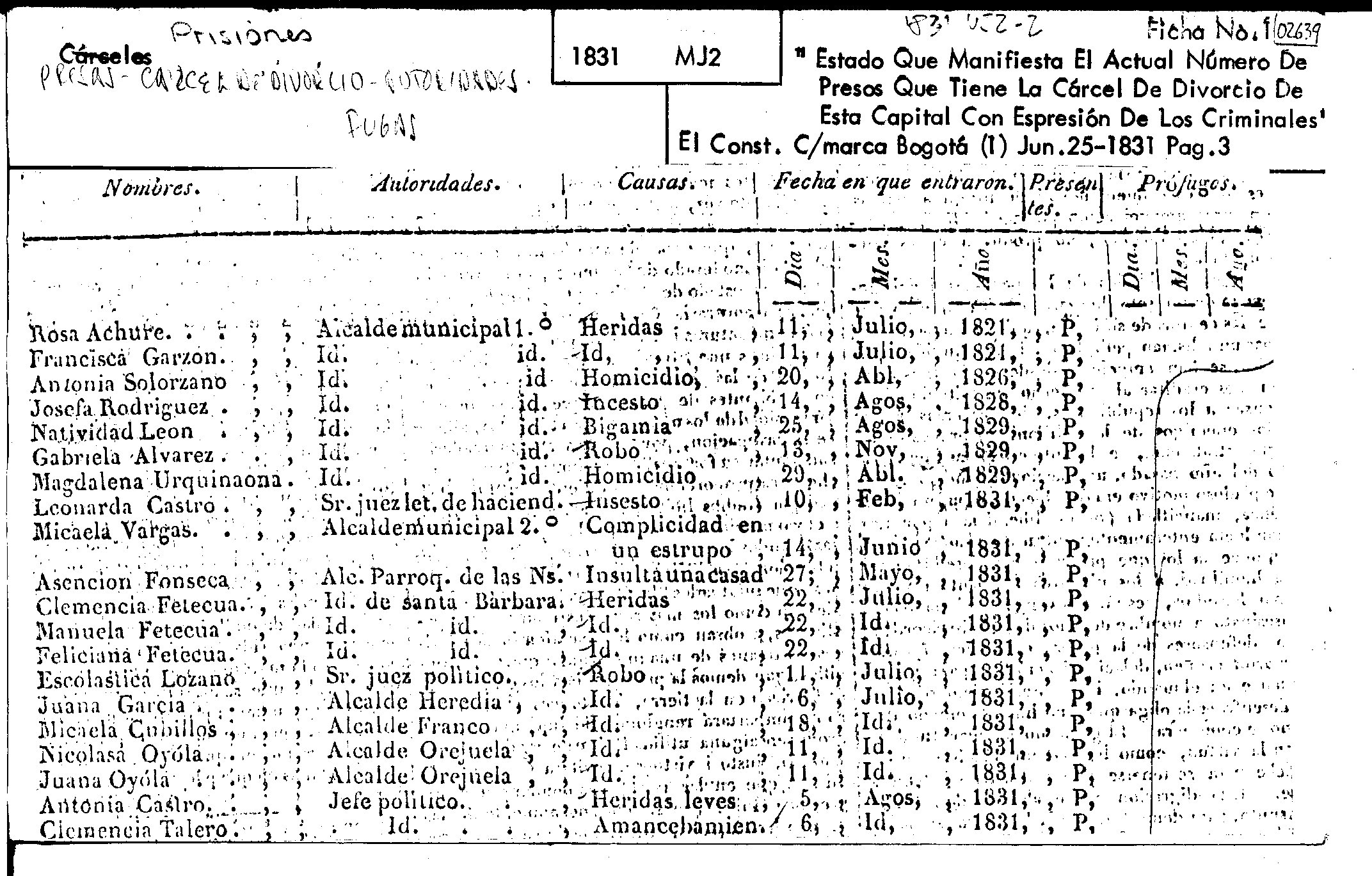 The image shows a news story about the number of prisoners in the divorce prison, in which the names, date they entered and the crime they committed are presented, in addition to the authorities who apprehended them. News published in the Constitutional Court of Cundinamarca, June 25, 1831