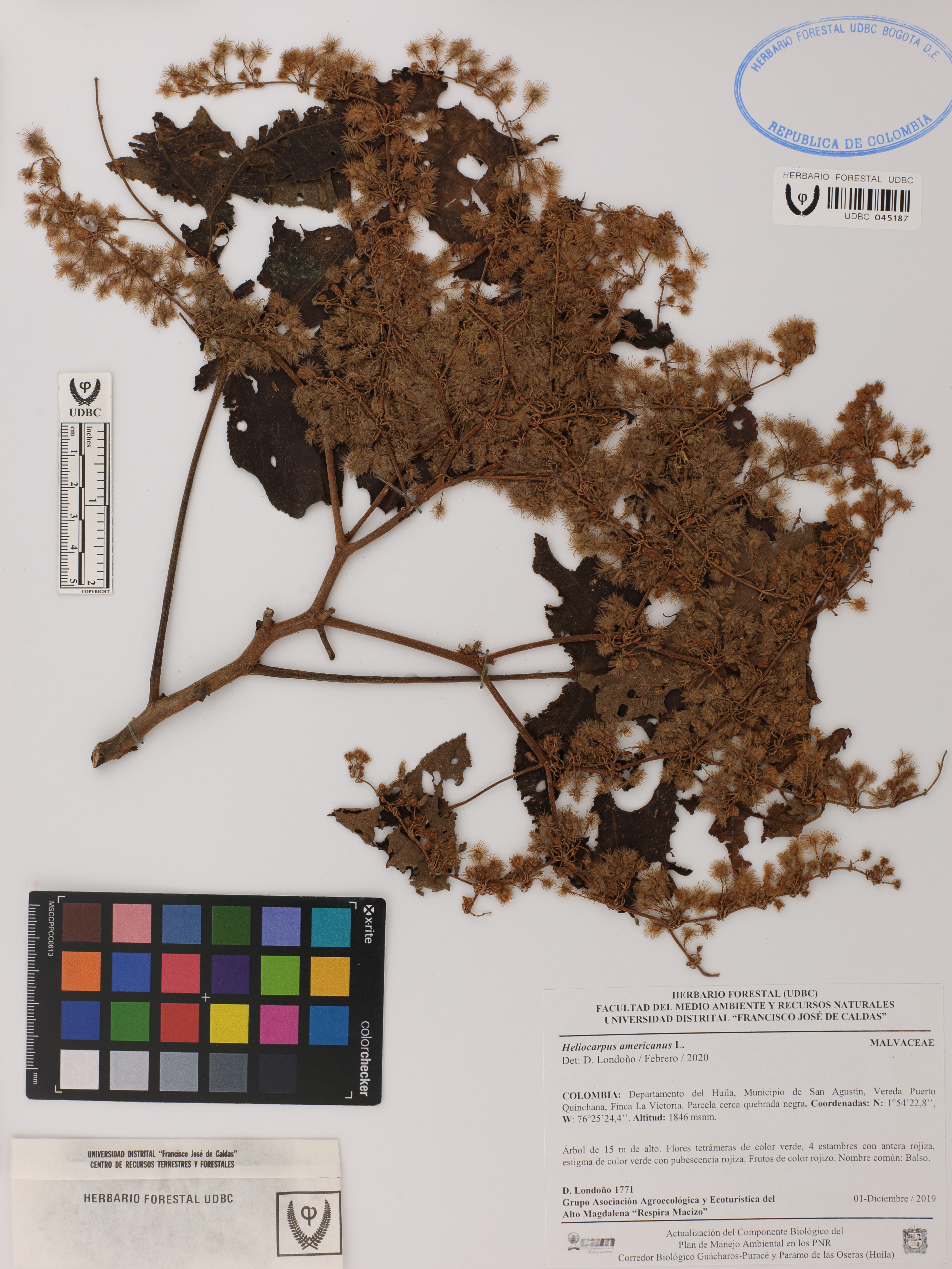 Fotografía del ejemplar Londoño, D. 1771, determinado como Heliocarpus americanus en el año 2020
