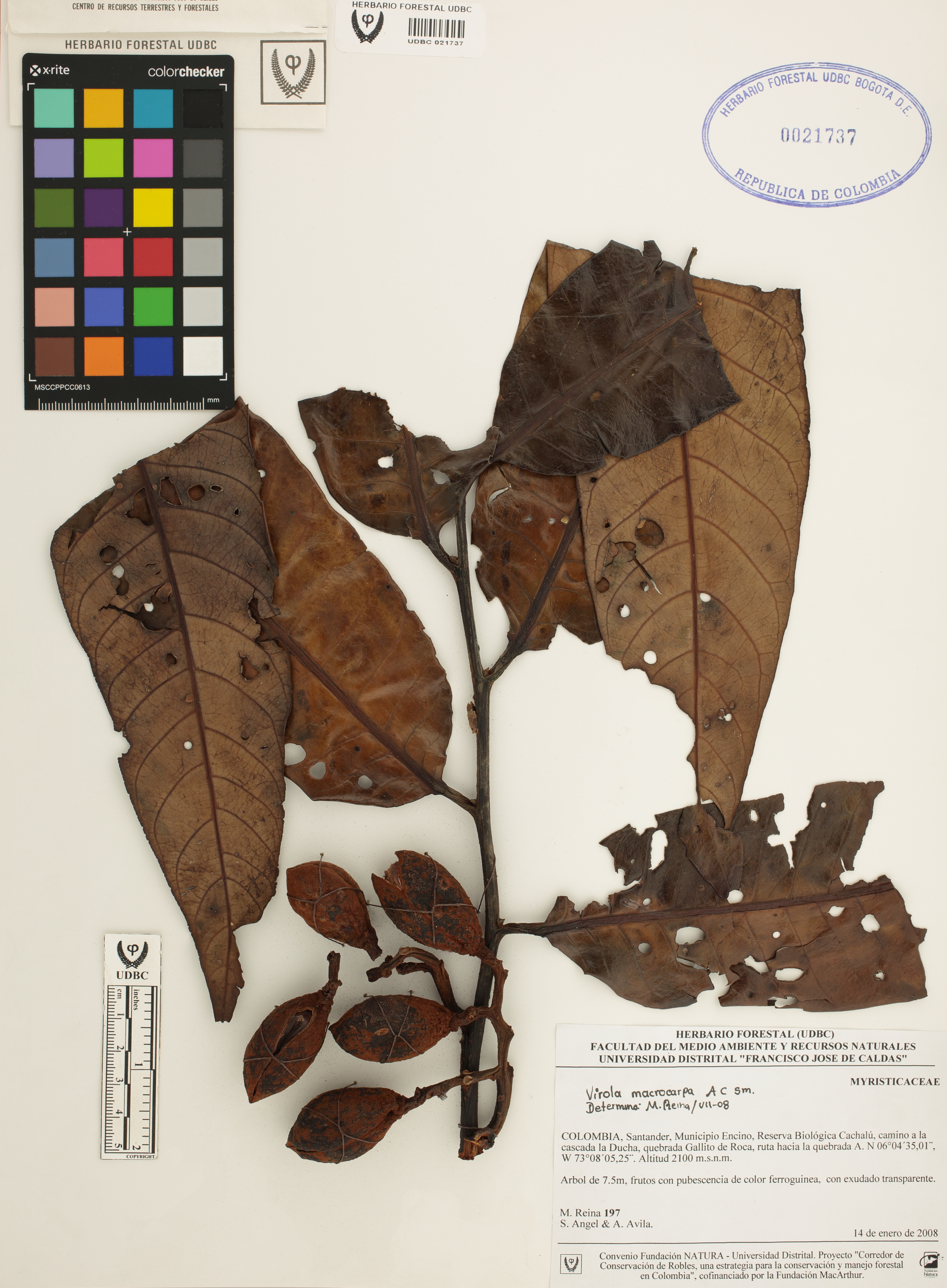 Fotografía del ejemplar Reina, M. 197, determinado como Virola macrocarpa en el año 2008