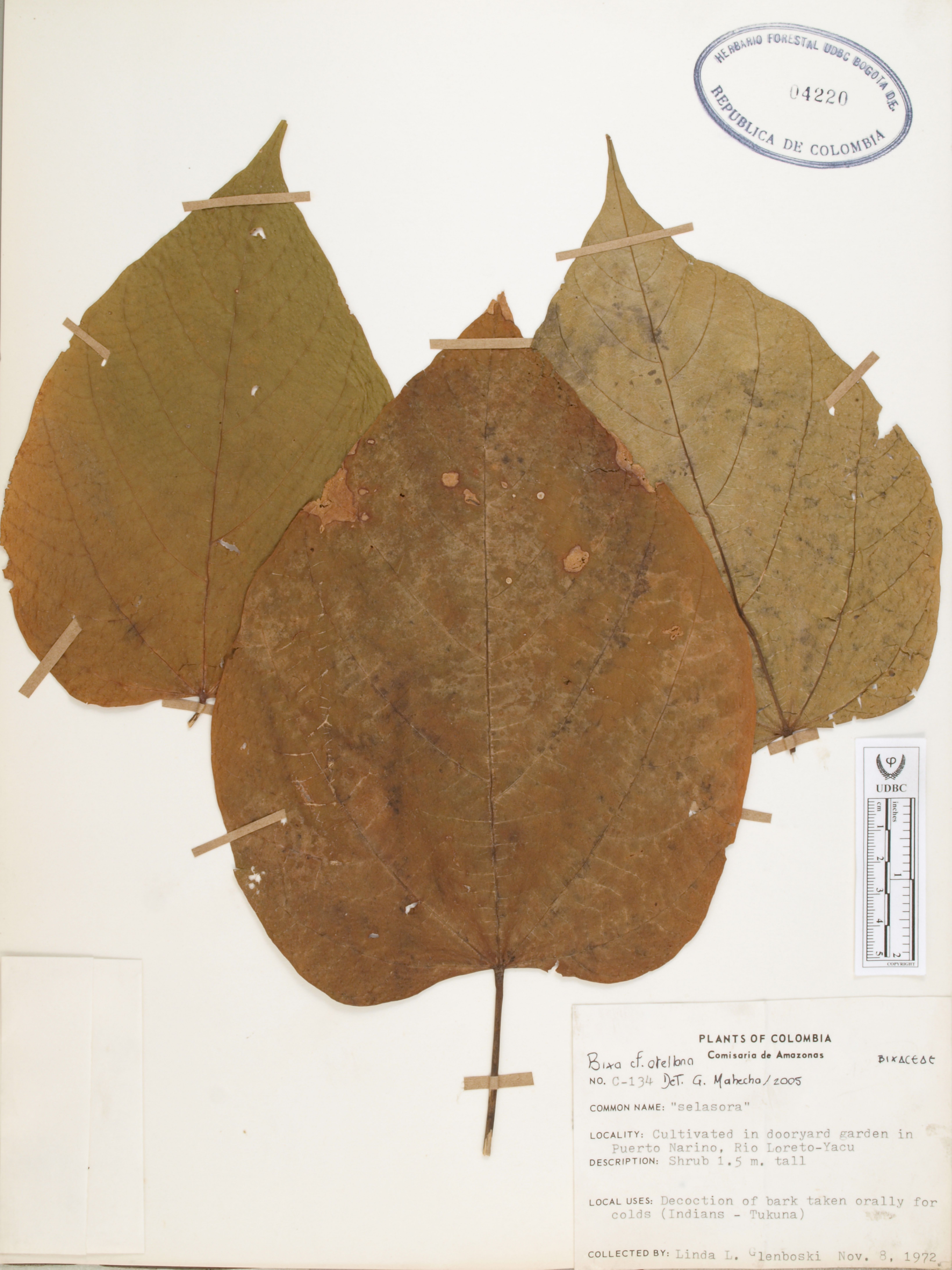 Fotografía del ejemplar Glenboski, L. 134, determinado como Bixa orellana en el año 2005